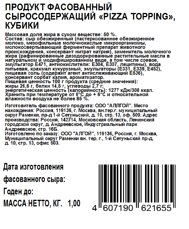 Продукт сыросодержащий Terra del Gusto Chef для пиццы нарезка кубики 50%, 1кг