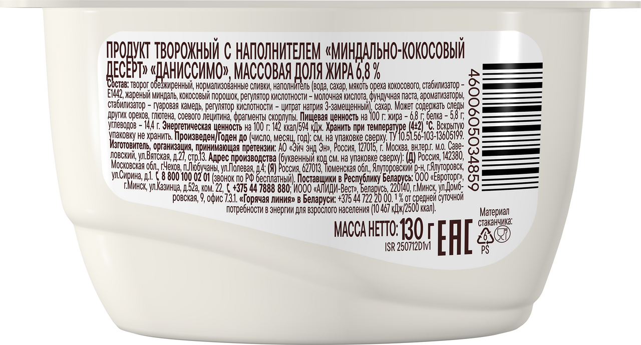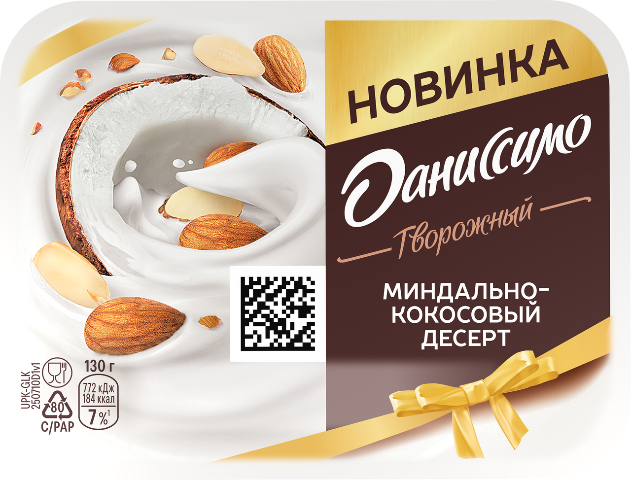 Новый творожный десерт Даниссимо миндально-кокосовый десерт - это идеальное сочетание невероятно сливочной текстуры творожка фундучной основой с кусочками миндаля и коксовой стружкой. Насладись Даниссимо, и пусть весь мир подождет.