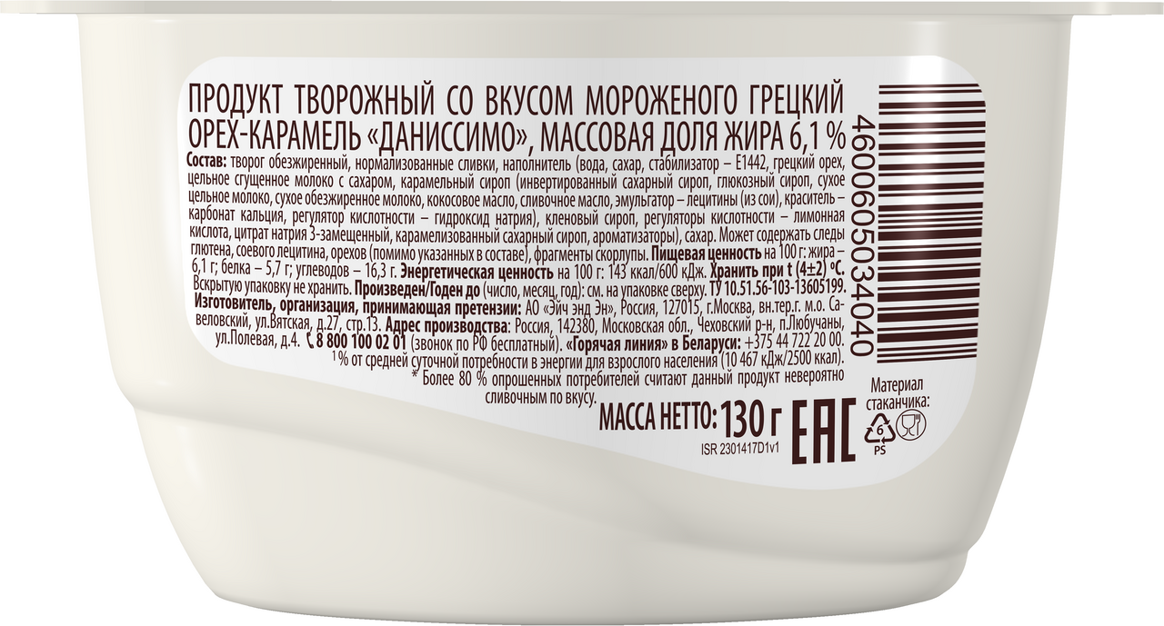 Продукт творожный Даниссимо Мороженое с грецким орехом и карамелью 6.1%, 130г