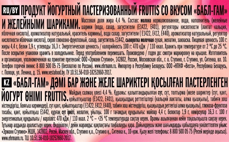Продукт йогуртный Fruttis бабл гам 4.4%, 180г