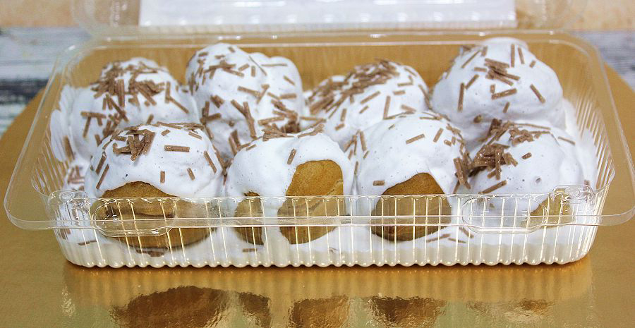Крем растительный жировой для взбивания, сахар-песок, соль поваренная пищевая, ароматизатор, вода, яйца куриные пищевые, мука пшеничная хлебопекарная высший сорт, маргарин домашний М650, соль, заварной крем холодного приготовления Фрио, масло крестьянское сладко-сливочное несоленое, молоко цельное сгущенное с сахаром, глазурь кондитерская, кислота сорбиновая.