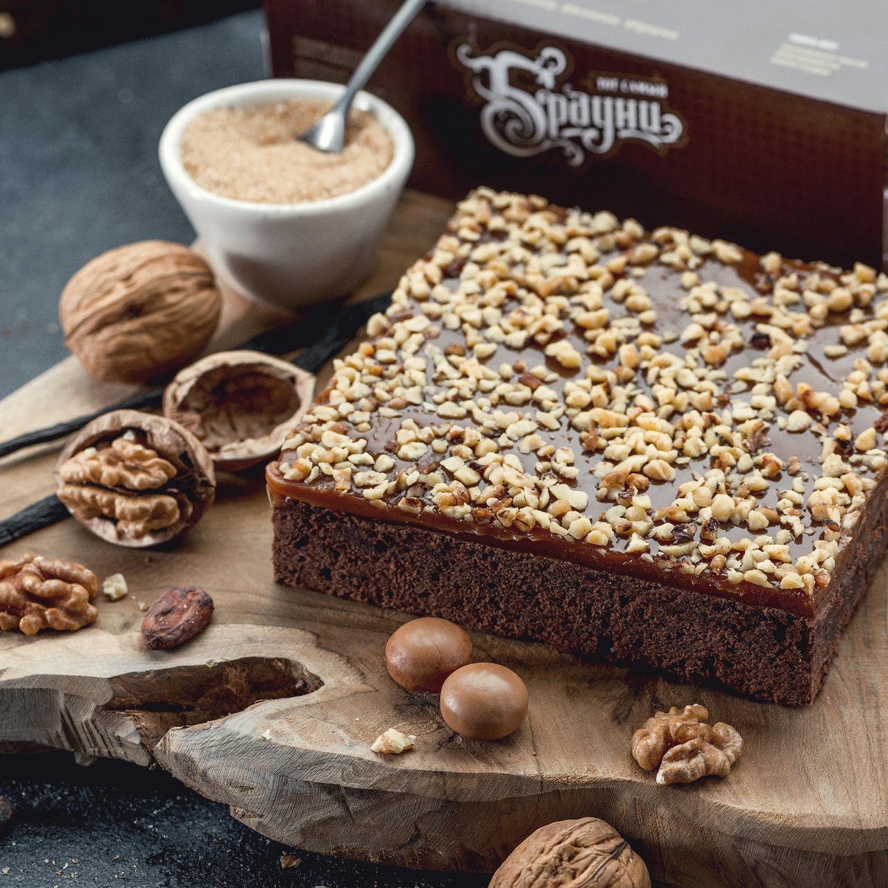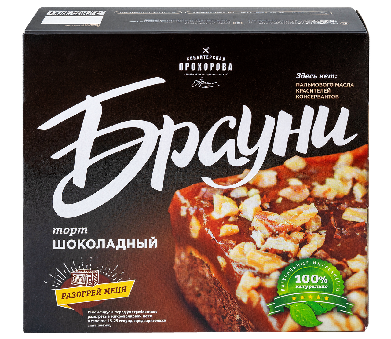 Десерт изготовлен вручную из органической муки, тростникового сахара и какао благородного сорта тринитарио. Верх покрыт слоем карамели из сливок с морской солью и посыпан грецким орехом. Основа этого знаменитого торта - буквально пропитанный шоколадом плотный и чуть влажный корж. В классическом рецепте он полит шоколадом и сверху, но вариантов его приготовления существует огромное количество. В нашем интернет-магазине вы можете купить оригинальный и очень вкусный тот самый шоколадный торт Брауни от Кондитерской Прохорова. Он сделан из отборных натуральных ингредиентов и 100% тертого какао, покрыт слоем мягкой соленой карамели и посыпан ореховой крошкой.