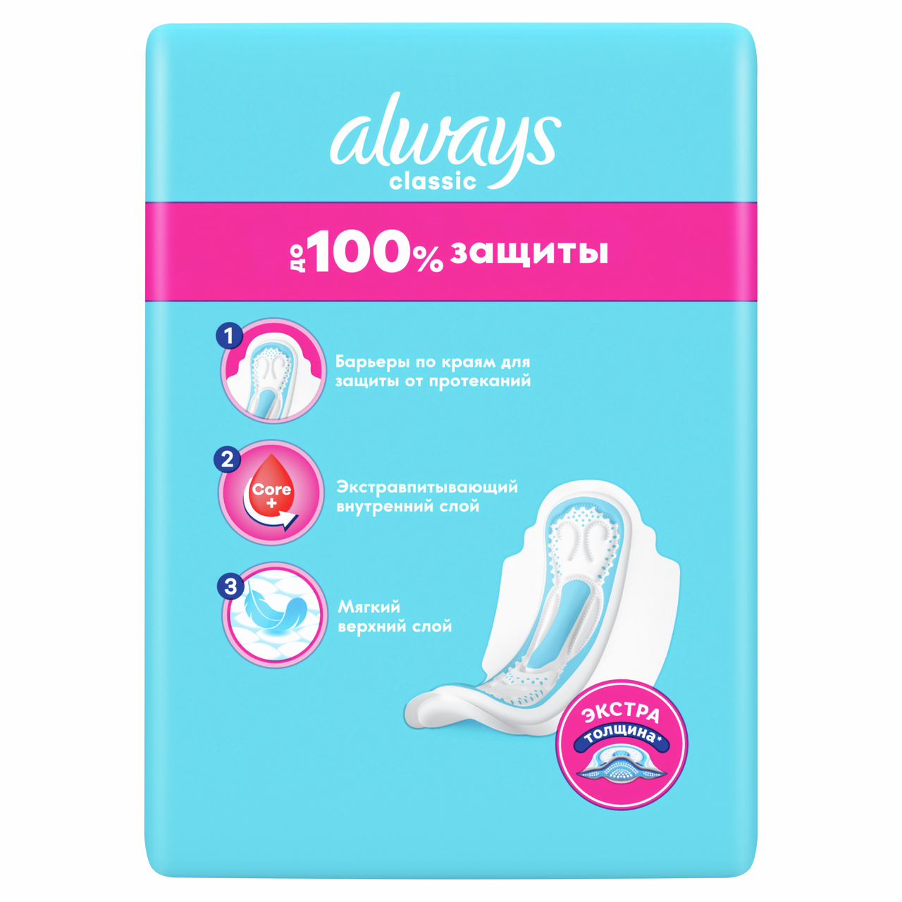 Гигиенические прокладки Always Classic Longl с крылышками и тремя активными зонами дарят ощущение чистоты и обеспечивают защиту в течение всего дня. Преимущества:- Защита и ощущение чистоты- 3 активные зоны.- Гигиенические прокладки с крылышками. В индивидуальной упаковке. Оснащены технологией нейтрализации запаха, которая блокирует неприятный запах, а не просто маскирует его. Гигиенические прокладки Always Ultra толщиной всего 3 мм дарят комфорт и обеспечивают непревзойденную защиту во время менструации.