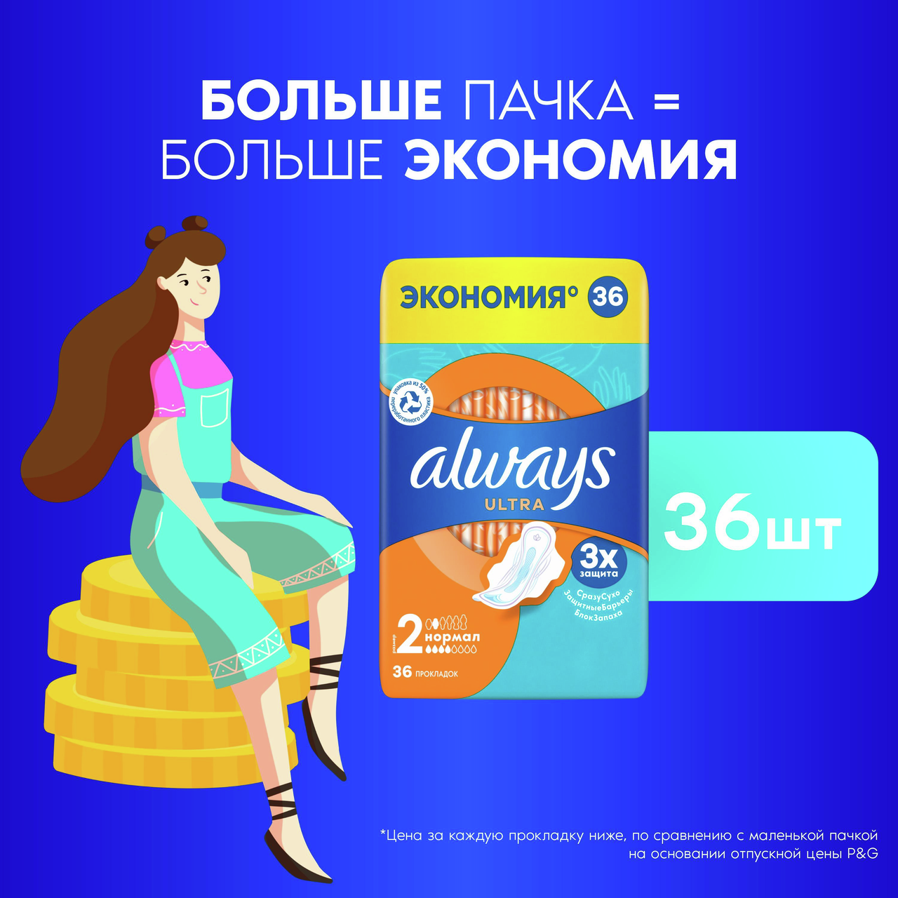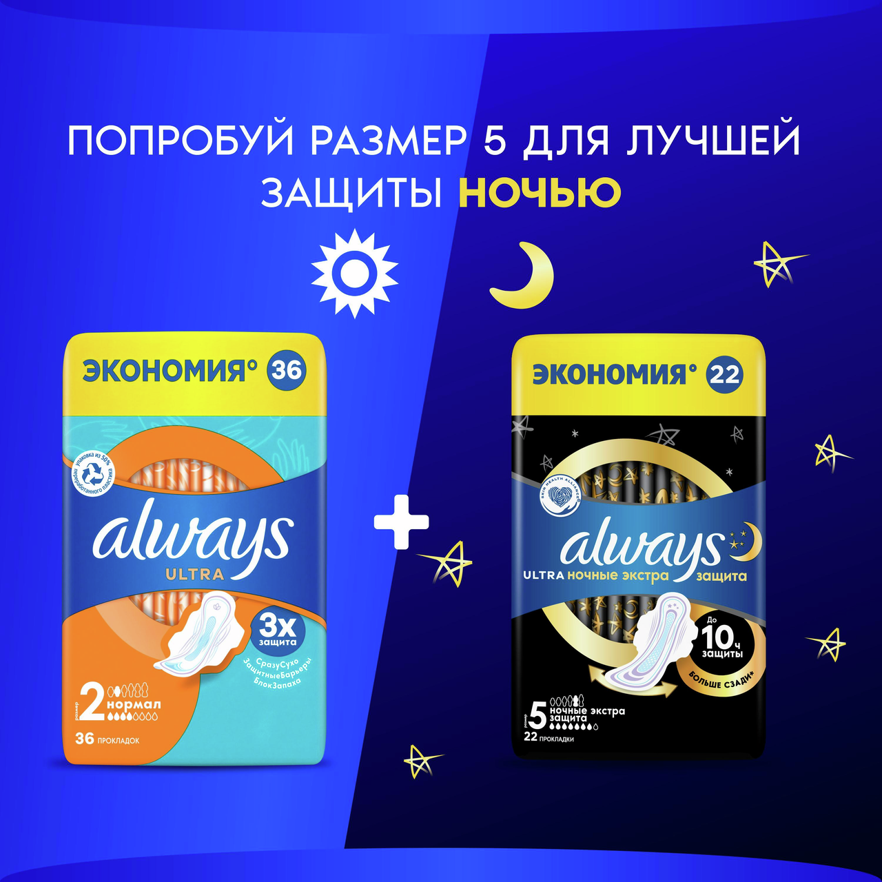 Тройная защита от Always- не соглашайтесь на меньшее: в Always Ultra Normal (Размер 2) с крылышками используется новейшая технология для создания многофункциональной гигиенической прокладки с 3 элементами защиты. Система Сразу сухо впитывает влагу за считаные секунды и не дает ей соприкасаться с кожей. Технология Защитные барьеры удерживает жидкость, предотвращая протекания. Технология Блок запаха нейтрализует неприятные запахи, придавая ощущение свежести и чистоты во время менструации. С Always Ultra вы можете чувствовать себя уверенно весь день. Тройная защита от Always— не соглашайтесь на меньшее. Формула дерматологически одобрена Ассоциацией здоровья кожи (Skin Health Alliance). Попробуйте Always Ultra Secure Night Extra с крылышками- лучшие гигиенические прокладки Always для защиты в ночное время. Обеспечьте себе наилучшую защиту с помощью Always My Fit— специальной системы определения размера, которая помогает правильно подобрать прокладку ALWAYS на основании количества выделений и размера трусиков. Супервпитывающий внутренний слой с системой Сразу сухо, которая впитывает жидкость за считаные секунды. Технология Защитные барьеры удерживает жидкость, предотвращая протекания. Технология Блок запаха нейтрализует неприятные запахи. Гигиенические прокладки не раздражают кожу (доказано дерматологами). Крылышки помогают удерживать прокладку на месте для надежной защиты и ощущения комфорта.