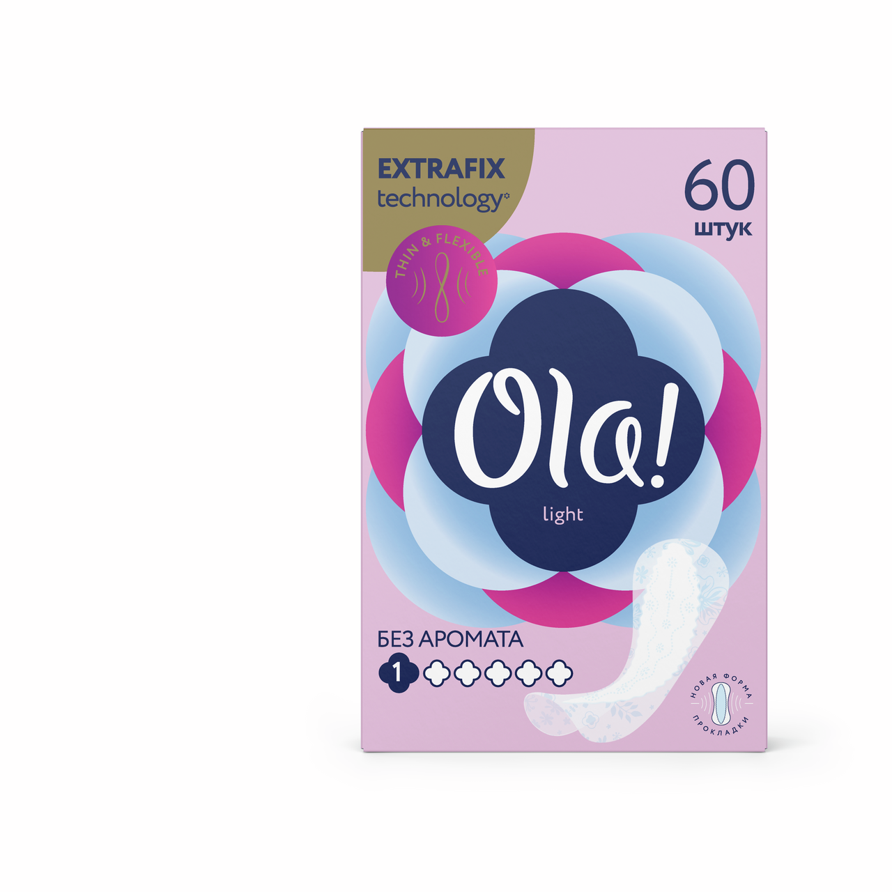 Ежедневные прокладки Мультиформ без отдушки. Ультратонкие ежедневные прокладки Ola! Light позволяют оставаться вашему белью свежим в течение всего дня. Специальная форма прокладки подходит к любому типу нижнего белья и имеет толщину всего 1 мм, что позволяет прокладкам быть совершенно незаметными. Гибкие и мягкие материалы удобно принимают форму нижнего белья и совсем не ощущаются при носке.