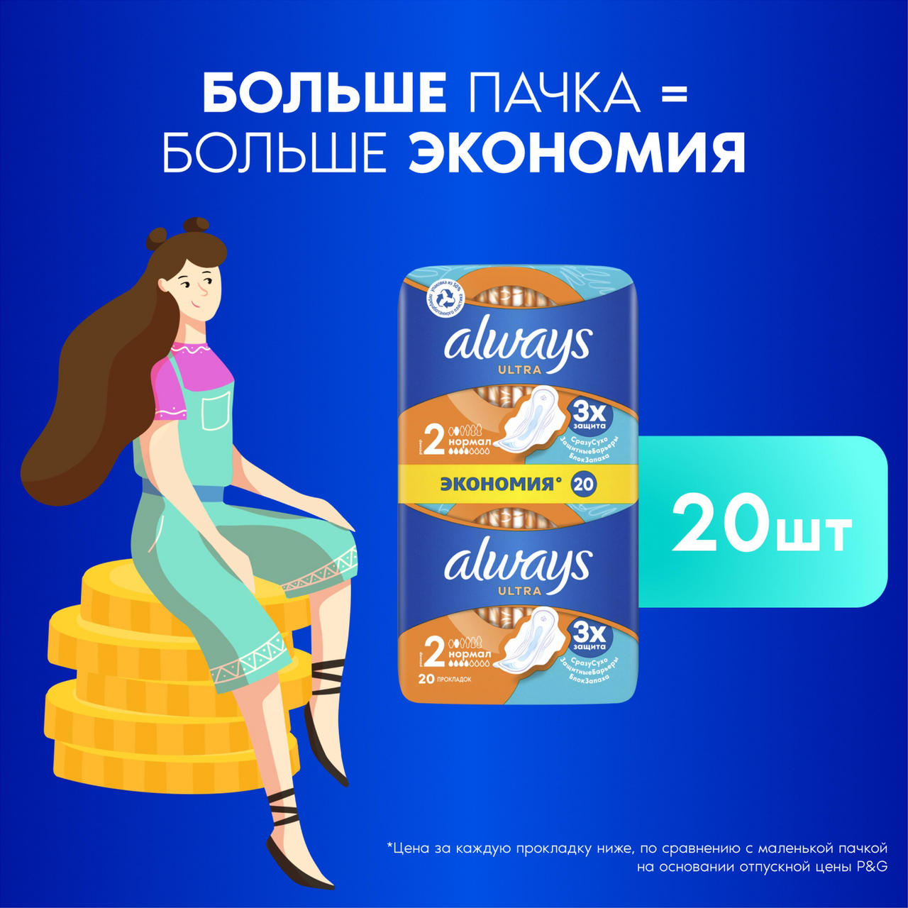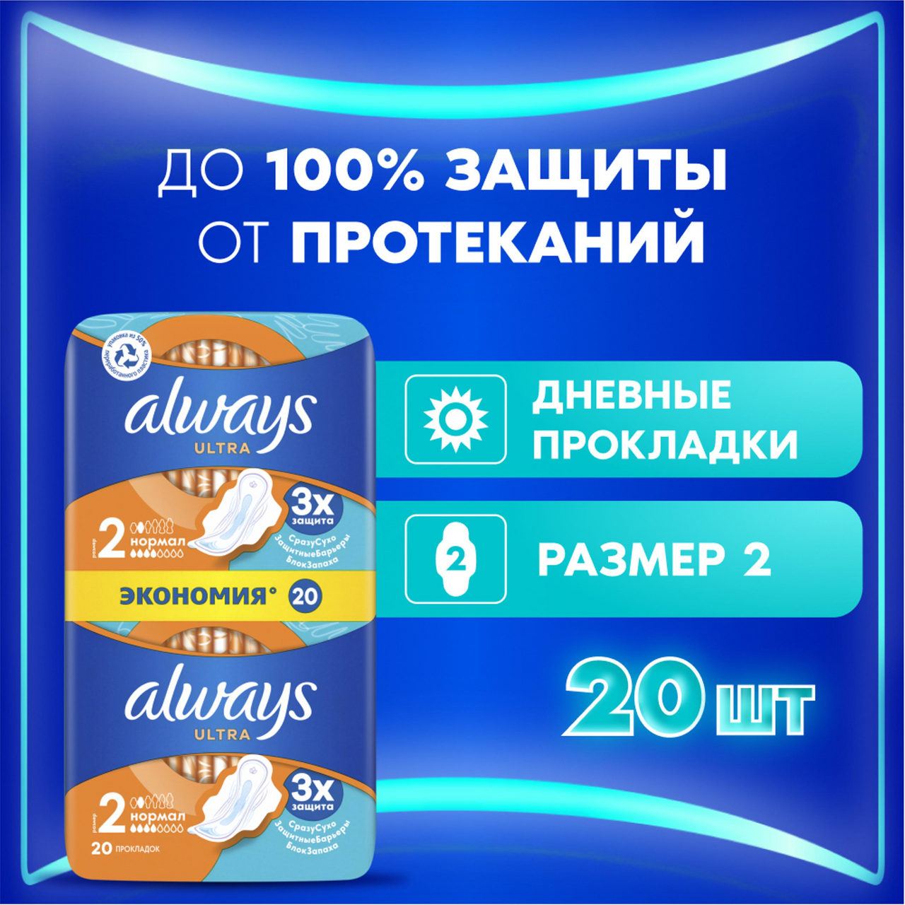 Тройная защита от Always— не соглашайтесь на меньшее: в Always Ultra Normal (Размер 2) с крылышками используется новейшая технология для создания многофункциональной гигиенической прокладки с 3 элементами защиты. Система Сразу сухо впитывает влагу за считаные секунды и не дает ей соприкасаться с кожей. Технология Защитные барьеры удерживает жидкость, предотвращая протекания. Технология Блок запаха нейтрализует неприятные запахи, придавая ощущение свежести и чистоты во время менструации. С Always Ultra вы можете чувствовать себя уверенно весь день. Тройная защита от Always— не соглашайтесь на меньшее. Формула дерматологически одобрена Ассоциацией здоровья кожи (Skin Health Alliance). Попробуйте Always Ultra Secure Night Extra с крылышками— лучшие гигиенические прокладки Always для защиты в ночное время. Обеспечьте себе наилучшую защиту с помощью Always My Fit— специальной системы определения размера, которая помогает правильно подобрать прокладку ALWAYS на основании количества выделений и размера трусиков. Супервпитывающий внутренний слой с системой Сразу сухо, которая впитывает жидкость за считаные секунды. Технология Защитные барьеры удерживает жидкость, предотвращая протекания. Технология Блок запаха нейтрализует неприятные запахи. Гигиенические прокладки не раздражают кожу (доказано дерматологами). Крылышки помогают удерживать прокладку на месте для надежной защиты и ощущения комфорта.