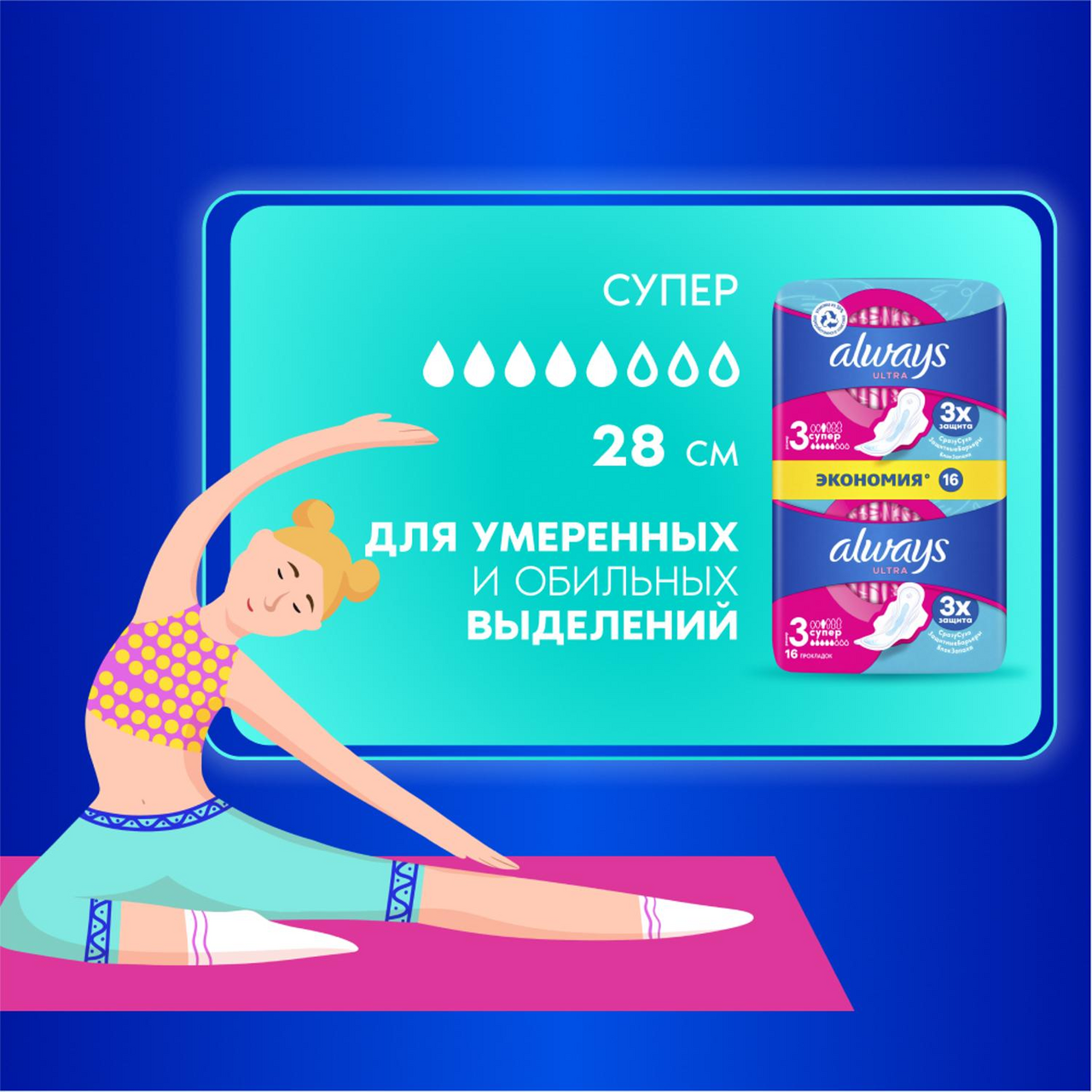 Тройная защита от Always— не соглашайтесь на меньшее: в Always Ultra Супер (Размер 3) с крылышками используется новейшая технология для создания многофункциональной гигиенической прокладки с 3 элементами защиты. Система Сразу сухо впитывает влагу за считаные секунды и не дает ей соприкасаться с кожей. Технология Защитные барьеры удерживает жидкость, предотвращая протекания. Технология Блок запаха нейтрализует неприятные запахи, придавая ощущение свежести и чистоты во время менструации. С Always Ultra вы можете чувствовать себя уверенно весь день. Тройная защита от Always— не соглашайтесь на меньшее. Формула дерматологически одобрена Ассоциацией здоровья кожи (Skin Health Alliance). Попробуйте Always Ultra Secure Night Extra с крылышками— лучшие гигиенические прокладки Always для защиты в ночное время. Обеспечьте себе наилучшую защиту с помощью Always My Fit— специальной системы определения размера, которая помогает правильно подобрать прокладку Always на основании количества выделений и размера трусиков. Супервпитывающий внутренний слой с системой Сразу сухо, которая впитывает жидкость за считаные секунды. Технология Защитные барьеры удерживает жидкость, предотвращая протекания. Технология Блок запаха нейтрализует неприятные запахи. Гигиенические прокладки не раздражают кожу (доказано дерматологами). Крылышки помогают удерживать прокладку на месте для надежной защиты и ощущения комфорта.