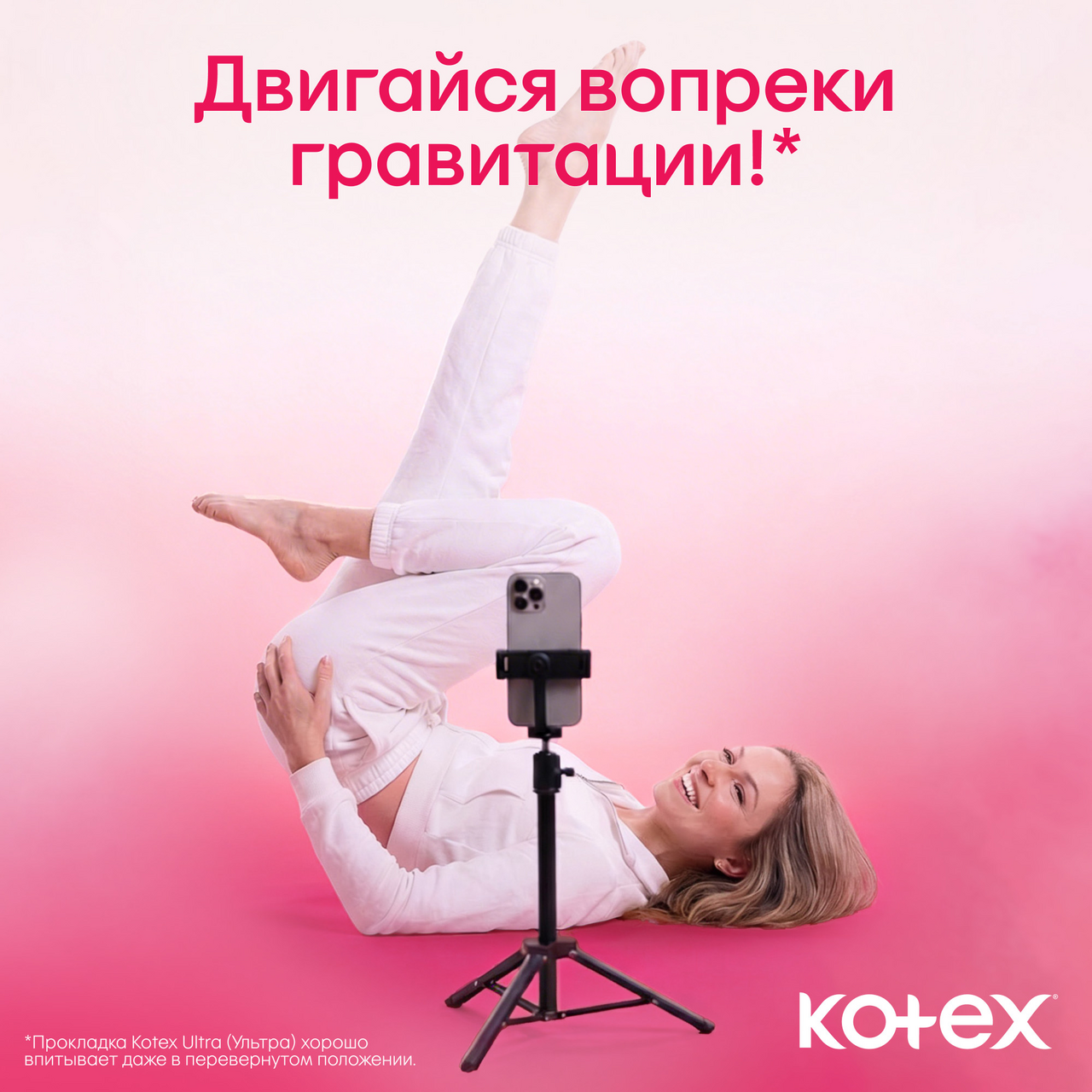 KotexUltra Нормал для умеренных выделений. Улучшенная защита и новый стильный дизайн. Обеспечивают комфорт и уверенность до 100%*. Прокладка стала более гибкой, чтобы лучше подстраиваться под анатомию твоего тела и защищать от протеканий. Уникальный 3D центр – быстро впитывает. Эластичные желобки – придают прокладке гибкость для защиты от протеканий сзади. Подстраивающийся внутренний слой – адаптируется под анатомию твоего тела. Покрытие мягкая сеточка для максимального комфорта и сухости кожи. Мягкие крылышки, надежно крепятся к белью и не натирают кожу. Эстетичная форма прокладки и нежный женственный дизайн добавят удовольствия при использовании. Обновленный дизайн упаковки – стильный и современный.