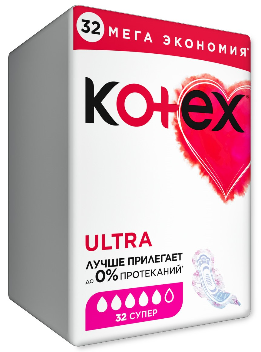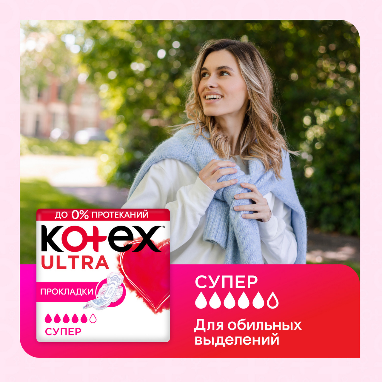 KotexUltra Супер с удлиненным задним краем для обильных выделений. Улучшенная защита и новый стильный дизайн. Обеспечивают комфорт и уверенность до 100%*. Прокладка стала более гибкой, чтобы лучше подстраиваться под анатомию твоего тела и защищать от протеканий. Выбирай упаковку с сердечком! Уникальный 3D центр – быстро впитывает. Эластичные желобки – придают прокладке гибкость для защиты от протеканий сзади. Подстраивающийся внутренний слой – адаптируется под анатомию твоего тела. Покрытие мягкая сеточка для максимального комфорта и сухости кожи. Мягкие крылышки, надежно крепятся к белью и не натирают кожу. Эстетичная форма прокладки и нежный женственный дизайн добавят удовольствия при использовании. Обновленный дизайн упаковки – стильный и соврем��нный.