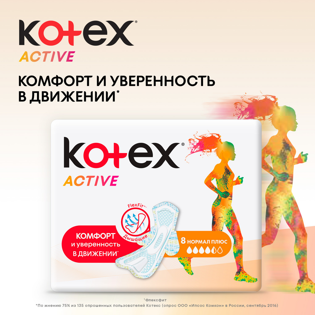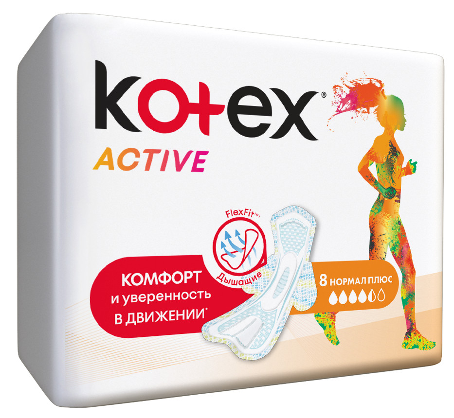 Новые ультратонкие прокладки Kotex Active Normal, созданы специально для активных девушек. Благодаря технологии FlexFit они повторяют движения тела, а дышащая поверхность обеспечивает коже комфорт и уверенность в движении. 1. Благодаря уникальной технологии FlexFitTM прокладка гибкая, поэтому может повторять движения тела даже во время активных занятий. 2. Дышащие задняя и передняя поверхности: более 100 000 дышащих микропор созданы, чтобы обеспечить комфорт коже. 3. Инновационный центр Fast Absorb впитывает жидкость за секунды, помогая предотвратить протекание. 4. Уникальная форма: более широкая поверхность сзади для комфортного ношения и лучшей защиты. 5. Современная стильная упаковка, эстетичная форма прокладки Котекс и нежный женственный дизайн.