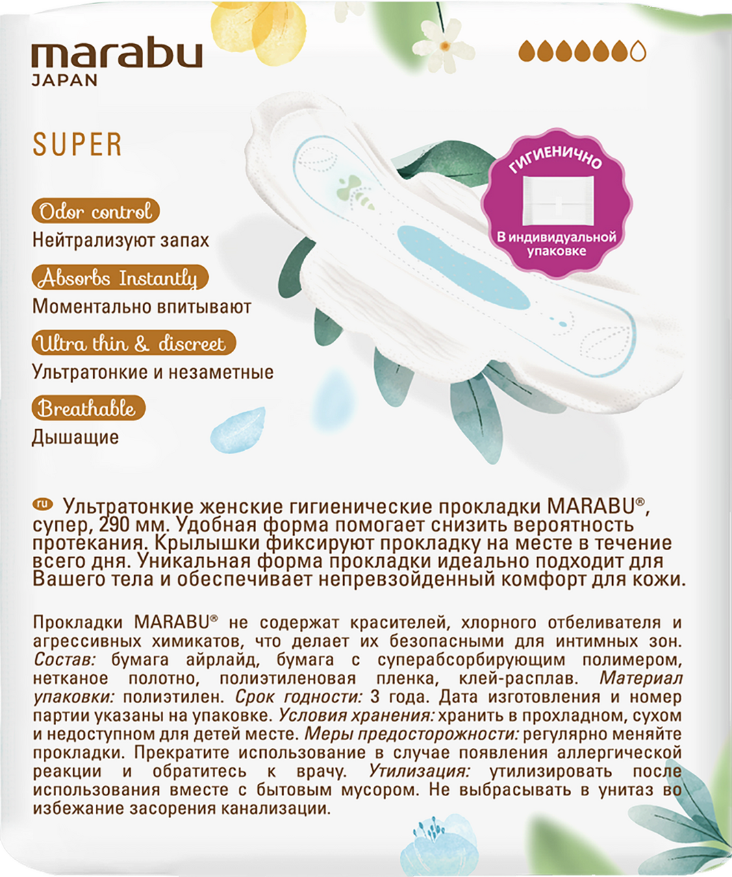 Комфорт и защита важны для каждой женщины в критические дни. Marabu разработали средства женской гигиены, которые дарят ощущение чистоты и свежести в течение всего цикла. Средства для гигиены Marabu заботятся о женском здоровье. Специальная анатомическая формула. Разработаны совместно с гинекологами: отлично прилегают и повторяют линии тела. Тип прокладок: Super В упаковке 8шт. Ультратонкие, 6 капель, 290мм.