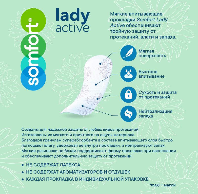 Somfort Lady Active Maxi (Сомфорт Леди Актив Макси) - супервпитывающие урологические прокладки с усиленной впитывающей способностью для защиты при легкой степени недержания. Благодаря гранулам суперабсорбента в составе впитывающего слоя быстро поглощают влагу, удерживая ее внутри прокладки, и нейтрализуют запах. Мягкие эластичные резиночки по бокам поддерживают форму прокладки и обеспечивают дополнительную защиту от протеканий. Мягкая поверхность дарит ощущение комфорта. Не содержат ароматизаторов, отдушек и латекса. Каждая прокладка в индивидуальной упаковке и ее удобно взять с собой.