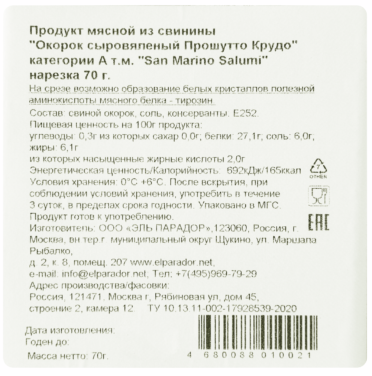 Окорок San Marino Salumi Прошутто Крудо сыровяленый нарезка, 70г
