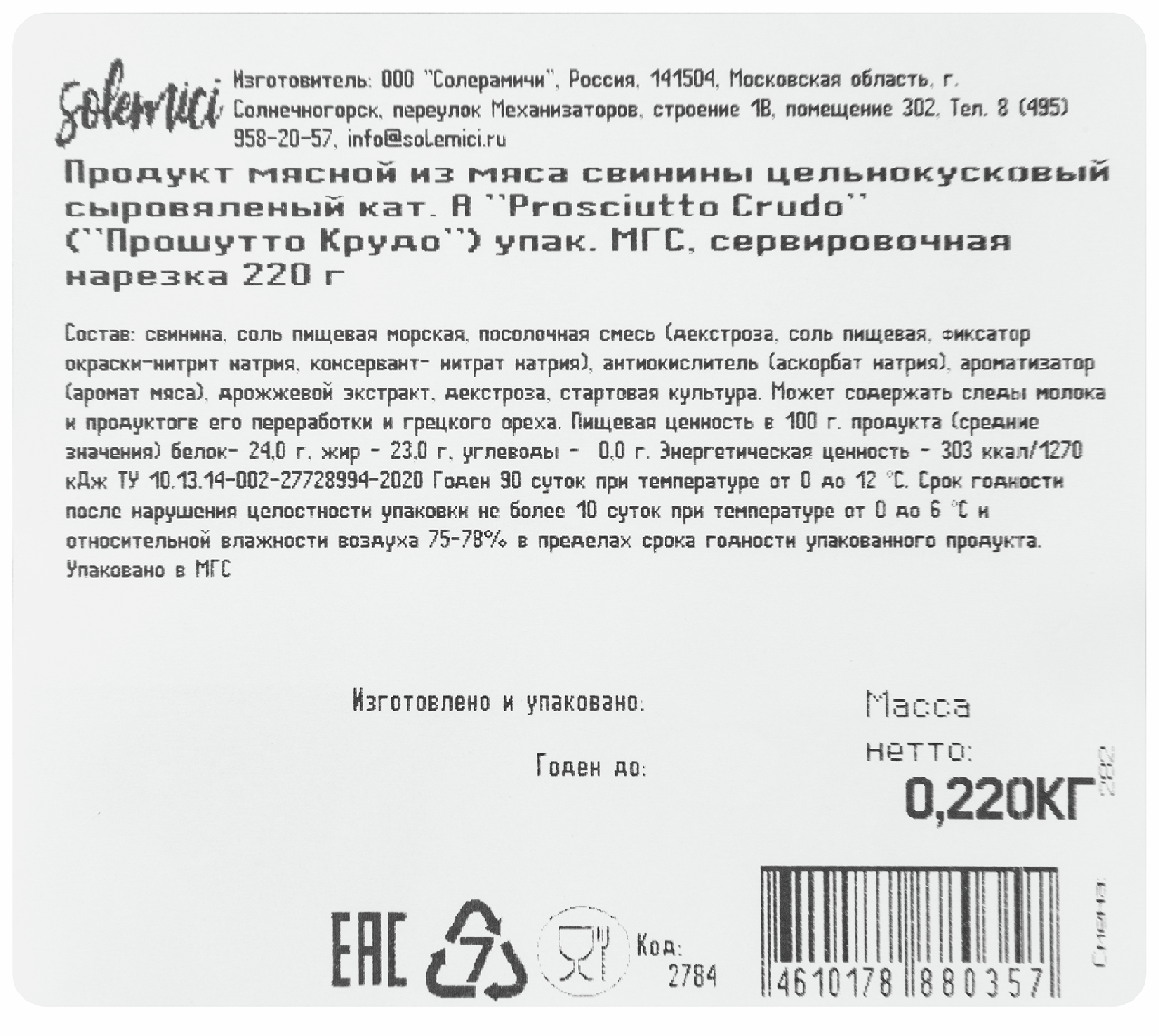 Прошутто Solemici crudo нарезка, 220г