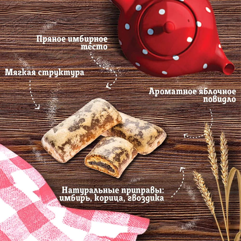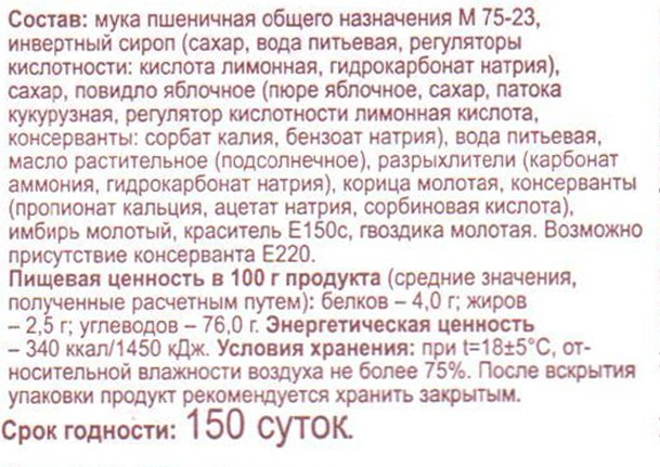 Мука пшеничная общего назначения М 75-23 инвертный сироп (сахар, вода питьевая, регуляторы кислотности: кислота лимонная, гидрокарбонат натрия), сахар, повидло яблочное (пюре яблочное, сахар, патока кукурузная, регулятор кислотности лимонная кислота, консерванты: сорбат калия, бензоат натрия), вода питьевая, масло растительное (подсолнечное), разрыхлители (карбонат аммония, гидрокарбонат натрия), корица молотая, консерванты (пропионат кальция, ацетат натрия, сорбиновая кислота), имбирь молотый, краситель Е150с, гвоздика молотая. Возможно присутствие консерванта Е220.