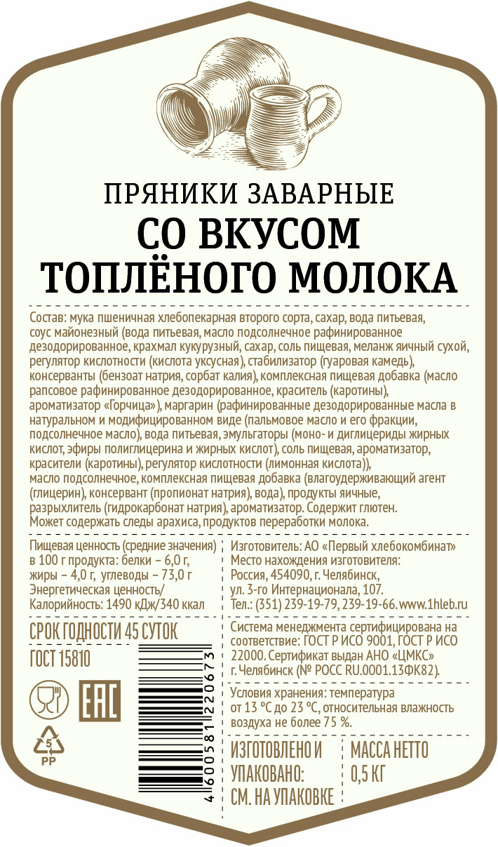 Пряники заварные Первый хлебокомбинат со вкусом топленого молока, 500г