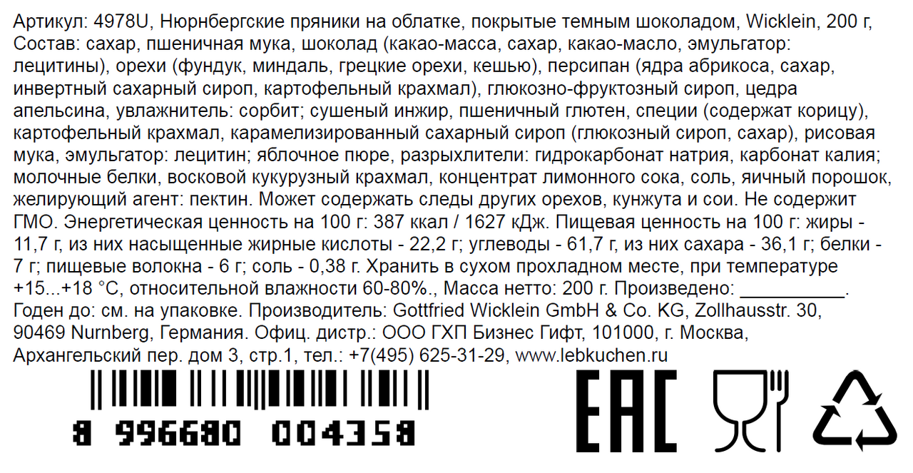 Сахар, пшеничная мука, шоколад какао-масса, сахар, какао-масло, эмульгатор: лецитины, орехи фундук, миндаль, грецкие орехи, кешью, персипан ядра абрикоса, сахар, инвертный сахарный сироп, картофельный крахмал, глюкозно-фруктозный сироп, цедра апельсина, увлажнитель: сорбит; сушёный инжир, пшеничный глютен, специи содержат корицу, картофельный крахмал, карамелизированный сахарный сироп глюкозный сироп, сахар, рисовая мука, эмульгатор: лецитин; яблочное пюре, разрыхлители: гидрокарбонат натрия, карбонат калия; молочные белки, восковой кукурузный крахмал, концентрат лимонного сока, соль, яичный порошок, желирующий агент: пектин.