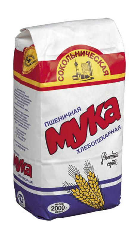 Мука Сокольническая пшеничная хлебопекарная высший сорт, 2кг.Пищевая ценность в 100г продукта: белки - 10г, жиры - 1г, углеводы - 69г. Энергетическая ценность: 330 ккал.Хранить в сухом прохладном месте.Срок годности 12 месяцев