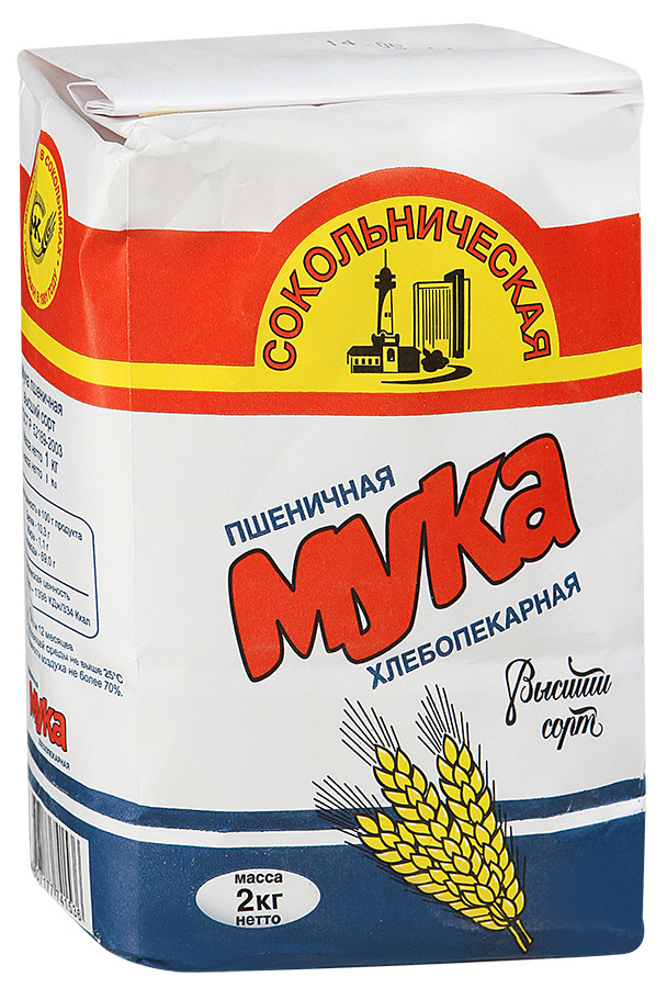 Мука Сокольническая пшеничная хлебопекарная высший сорт, 2кг.Пищевая ценность в 100г продукта: белки - 10г, жиры - 1г, углеводы - 69г. Энергетическая ценность: 330 ккал.Хранить в сухом прохладном месте.Срок годности 12 месяцев