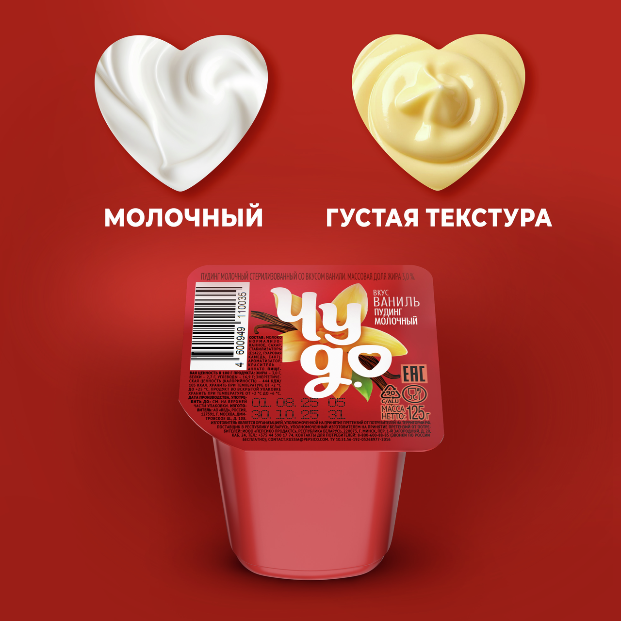 Густой пудинг Чудо со вкусом ванили. Густая текстура и нежный вкус. Отлично подходит для вкусного перекуса. Он обладает густой текстурой, нежным ярким вкусом ванили и позволяет насладиться сладкими моментами. Бренд Чудо больше 20 лет создает вкусные молочные продукты и десерты из отборных ингредиентов: питьевые йогурты, молочные коктейли, пудинги, глазированные сырки и йогурты с насыпками. Среди многообразия вкусов и текстур обязательно найдется что-то по вкусу каждому члену семьи.