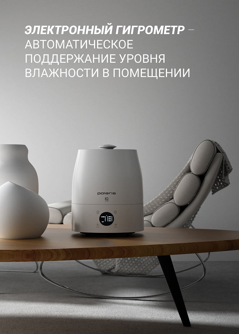 Увлаж��итель воздуха Polaris PUH 4040 Wi-Fi Home — настоящее спасение для квартиры или дома, в котором проживают дети или люди, склонные к аллергии. Девайс поддерживает необходимый уровень влажности в помещениях площадью до 45 кв. м. Он используется как в частных домах, так служебных помещениях, теплицах и оранжереях — в тех местах, где нужно создать особый микроклимат. Прибор создает комфортную атмосферу для здоровья человека, улучшает качество воздуха и снижает риск заболеваний дыхательных путей. Устройство отличается легкостью управления благодаря сенсорной панели. Для того, чтобы управлять моделью дистанционно, достаточно синхронизировать ее со смартфоном или планшетом. Также есть возможность подобрать голосового ассистента: Марусю от Mail. ru или Алису от Яндекс. Корпус из пластика отлично противостоит воздействию пыли, влаги, УФ-излучения и перепадам температуры. При бережном уходе на нем не образуются царапины и потертости. Для защиты внутренней поверхности имеется специальный фильтр очистки воды. В устройство также установлен резервуар для воды объемом 5,5 л. Оно расходует 350 мл воды в час, что приравнивается к 40 часам беспрерывной эксплуатации. Девайс безопасен, так как оснащен режимом автоотключения при отсутствии жидкости в баке. Удобной функцией оказалось наличие на панели электронного гигрометра. Он определяет уровень влажности в помещении и дает рекомендации по дальнейшему использованию прибора. Для корректировки показателей можно подобрать одну из трех скоростей подачи пара. Прибор гармонично вписывается в любой интерьер комнаты и размещается в любом месте: на комоде, журнальном столике, подоконнике или прикроватной тумбе.