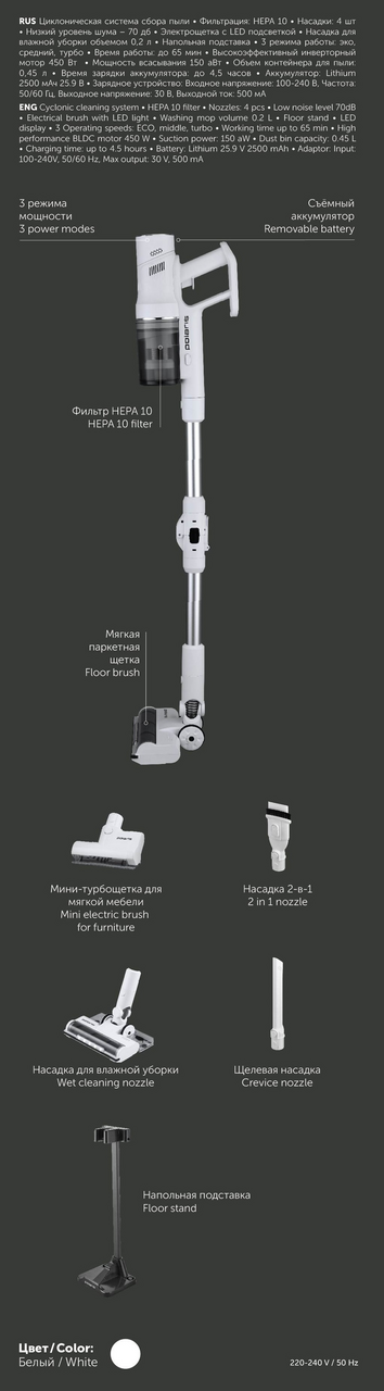 Сухая и влажная уборка.Мощность 450Вт. Мощность всасывания - 150 аВт. Емкость аккумулятора - 2500 мАч. Время работы без подзарядки: до 65 минут. Режимы мощности: эко, средний, турбо. Время зарядки аккумулятора: до 4,5 часов. LED дисплей показывает статус работы и уровень заряда батареи. Максимальный уровень шума - 70дБ. Доп. аксессуары: щелевая насадка, насадка 2 в 1, мини турбощетка, насадка для влажной уборки, напольная подставка. Объем контейнера для пыли: 0,45л. Объем насадки для влажной уборки: 0,2л. Гарантия: 2 года. Зарядное устройство: - Входное напряжение: 100-240В; - Частота: 50/60Гц; - Выходное напряжение: 30В; - Выходной ток: 0,5А.