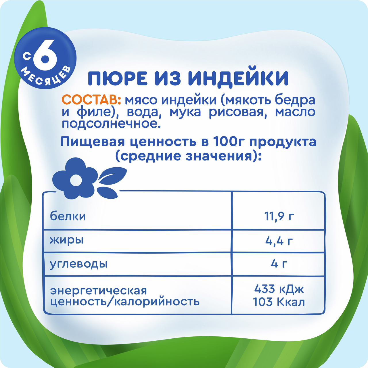 Детское мясное пюре Агуша Индейка – источник полноценного белка, а соответственно всех незаменимых аминокислот, которые нужна для роста и развития. Помимо ценного белка мясо еще содержит и гемовое железо, которое легко усваивает организмом малыша. Мясное пюре должно вводится в рацион малыша в 6 месяцев. Его можно добавлять к овощному пюре. Источник белка, необходимого для роста малыша. Без добавления соли, сахара и крахмала. Без добавления консервантов, красителей, ароматизаторов. Это натуральный гипоаллергенный мясной продукт для детского питания без соли, крахмала, красителей и ароматизаторов. Он изготовлен из высококачественного мяса индейки с добавлением рисовой муки, растительного масла и воды. Рекомендуется давать детям с 6-месячного возраста, начиная с 1 чайной ложки в день, постепенно увеличивая к 12 месяцам до 40-70 грамм. Имеет однородную пюреообразную консистенцию, можно добавлять в овощные пюре или злаковые каши, прогрев до 36-38 градусов. Открытую банку храните в холодильнике не более суток. Обратите внимание: перед введением нового продукта в рацион ребенка обязательно проконсультируйтесь с вашим педиатром!