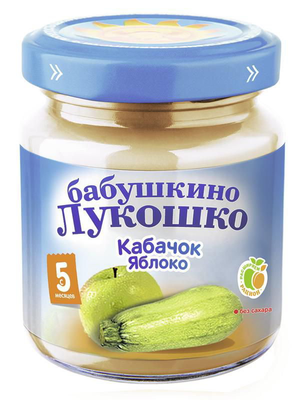 Пюре Бабушкино лукошко Кабачки с яблоком для питания детей с 5 месяцев. Отсутствие соли и сахара в пюре соответствует последним рекомендациям детских диетологов и позволяет сформировать привычки здорового питания с самого раннего возраста.Сочетание кабачков и яблок позволяет обогатить рацион ребенка калием, необходимым для работы сердечной мышцы, а большое количество пектинов помогает выводить из организма токси��ы. Малое количество клетчатки не раздражает слизистую оболочку кишечника.Состав: пюре из кабачков, пюре из яблок.