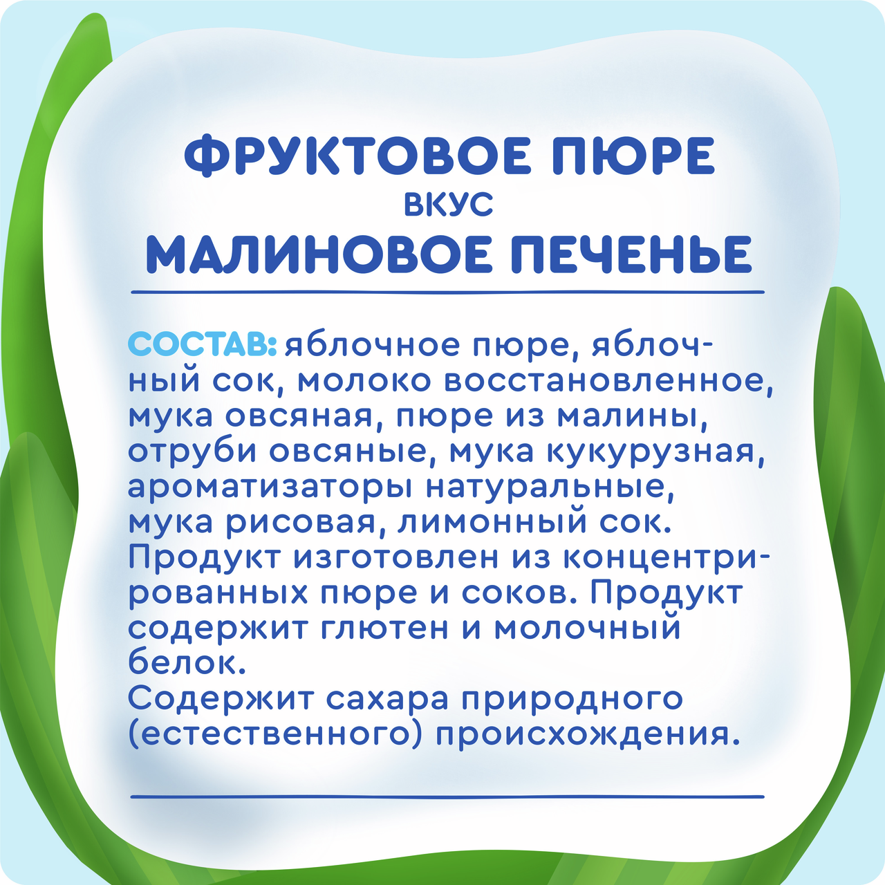 Яблочное пюре, яблочный сок, молоко восстановленное, мука овсяная, пюре из малины, отруби овсяные, мука кукурузная, ароматизаторы натуральные, мука рисовая, лимонный сок.