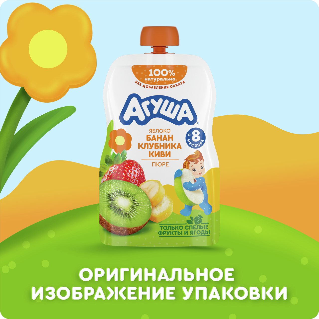 Пюре фруктовое Агуша из яблок, бананов, клубники и киви для детей от 8 месяцев в мягкой упаковке. Гомогенизированное. Возьмите на прогулку вкусный перекус от Агуша!