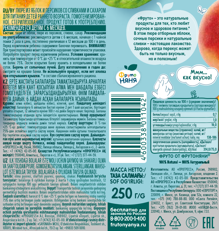 Гомогенизированное.Стерилизованное.100% натуральное.Без консервантов, красителей, искусственных добавок и ГМО.Изготовлено из концентрированных пюре.Состав: пюре из яблок, пюре из персиков, вода специально подготовленная.Пищевая ценность на 100г: углеводы 13,5г, калий 170-240мг.Энергетическая ценность: 54 ккал.Рекомендации по употреблению: рекомендуется детям с 5-ти месяцев, начиная с 0,5 чайной ложки 2 раза в день, постепенно увеличивая к 12 месяцам до 80-100г в день.Перед кормлением ребенка содержимое баночки перемешать.Хранить при температуре от 0C до +25C и относительной влажности не более 75%Беречь от солнечных лучей.После вскрытия хранить в холодильнике не более суток.Проконсультируйтесь с врачом. Срок годности: 1 год