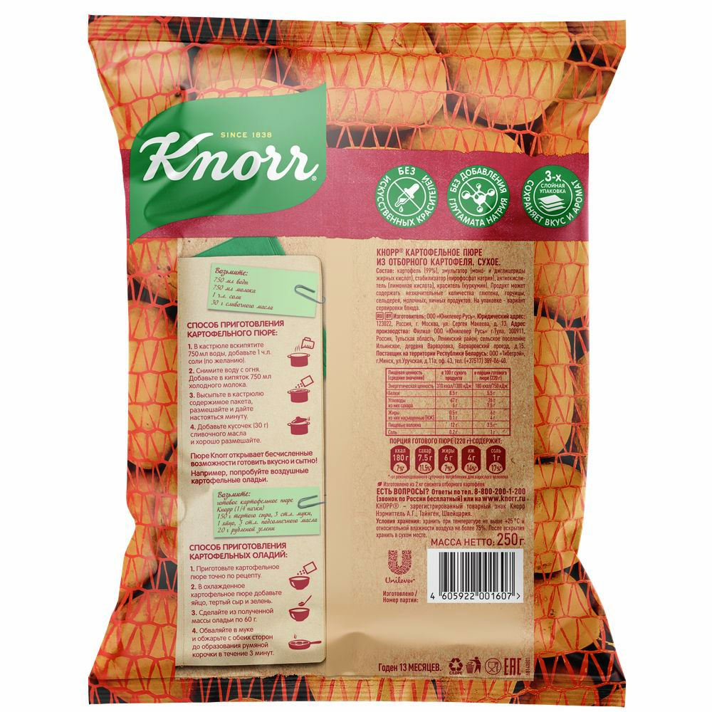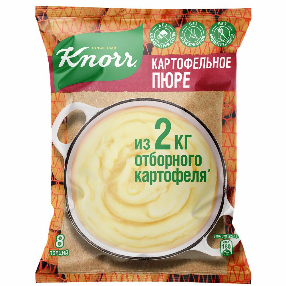 Knorr Пюре картофельное на 8 порции, 250 г. Заменяет 1800 г. свежего картофеля. Способ приготовления: вскипятить 750 мл воды, добавить 1 чайную ложку соли. Сниять воду с огня. Добавить в кипяток 750 мл холодного молока. Высыпать в кастрюлю содержимое пакета, размешать и дать постоять 1 минуту. Добавить 3 кусочка масла или тертого сыра и размешать. Пюре Картошечка быстрого приготовления. Готовое пюре~2,4 кг. Состав: картофельные хлопья (99%), эмульгатор Е471, антиоксиданты (Е223, Е300, Е304), регулятор кислотности (Е330, лимонная кислота). Продукт генетически не модифицирован. Энергетическая ценность: 369 ккал. Пищевая ценность в 100г сухого продукта: белки 7г, жиры 1г, углеводы 83г. Хранить в сухом прохладном месте. Срок годности: 12 месяцев.
