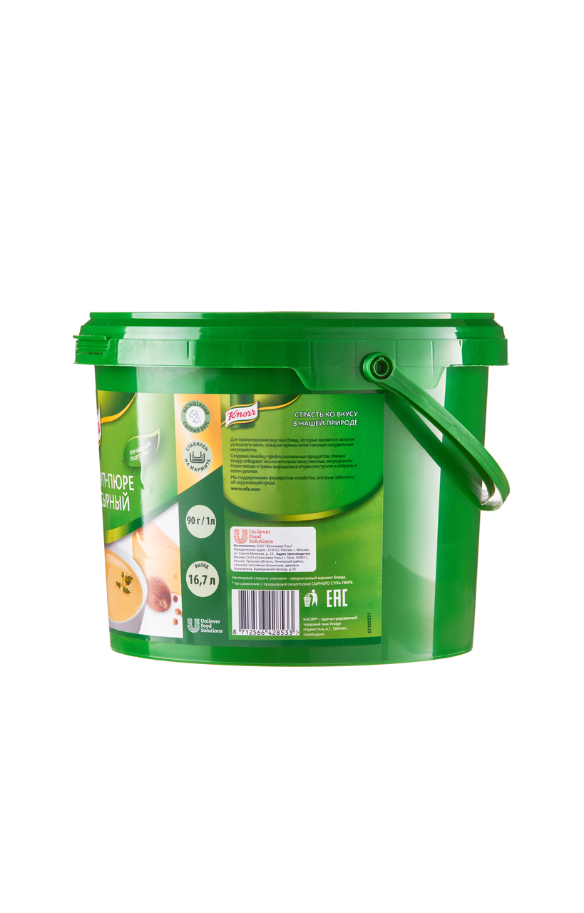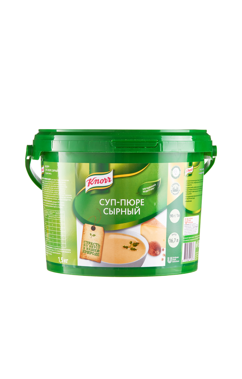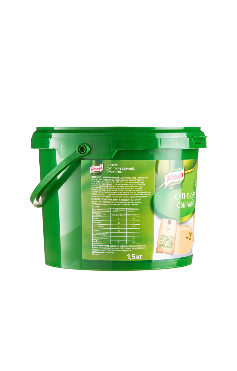 Knorr Суп-пюре Сырный Сухая смесь (1,5кг) - это густая консистенция, без комочков. Стабильное качество и минимизация списаний. Быстрота и удобство приготовления. Разнообразьте свое меню с помощью суповой линейки Knorr. Состав: Загустители: Е1422, Е415; растительный жир, сыр, мальтодекстрин, соль, пшеничная мука, усилители вкуса и аромата (глутамат натрия, инозинат натрия и гуанилат натрия), ароматизаторы (содержат соевый белок), лактоза, молочный белок, специи, регулятор кислотности лимонная кислота, краситель экстракт паприки. Продукт может содержать незначительные количества глютена, горчицы, сельдерея, молочных, яичных, рыбных продуктов.Срок годности 12 месяцев. Хранить при температуре не выше +25 Со и относительной влажности не более 75% с плотно закрытой крышкой.