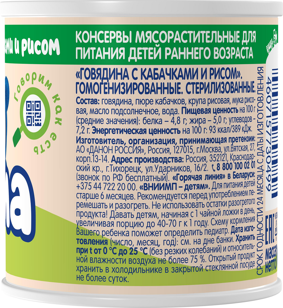Детское пюре Тёма из говядины с кабачками и рисом произведено из качественного мяса от проверенных российских поставщиков.* Без добавления соли, крахмала, консервантов, красителей и ГМО.* Контроль качества на всех этапах производства.* Прочная жестяная упаковка надежно защищает пюре, сохраняя качество и вкус натурального мяса, и не бьется. Тёма. Говорим как есть.