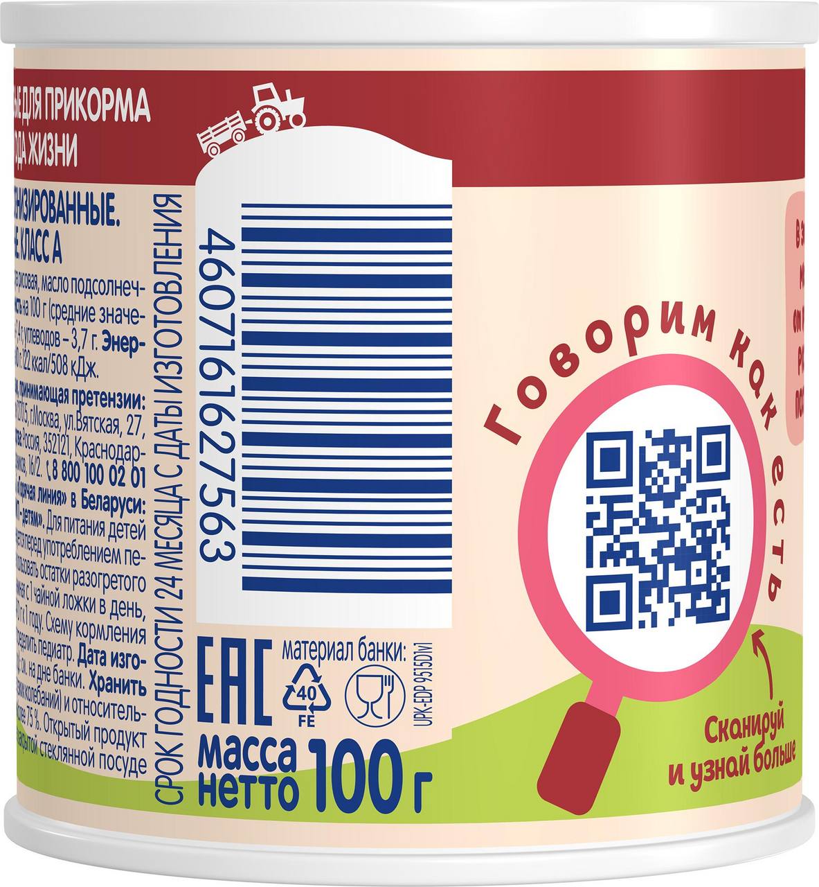 Детское пюре Тёма из кролика произведено из качественного мяса от проверенных российских поставщиков.* Без добавления соли, крахмала, консервантов, красителей и ГМО.* Контроль качества на всех этапах производства.* Прочная жестяная упаковка надежно защищает пюре, сохраняя качество и вкус натурального мяса, и не бьется. Тёма. Говорим как есть.