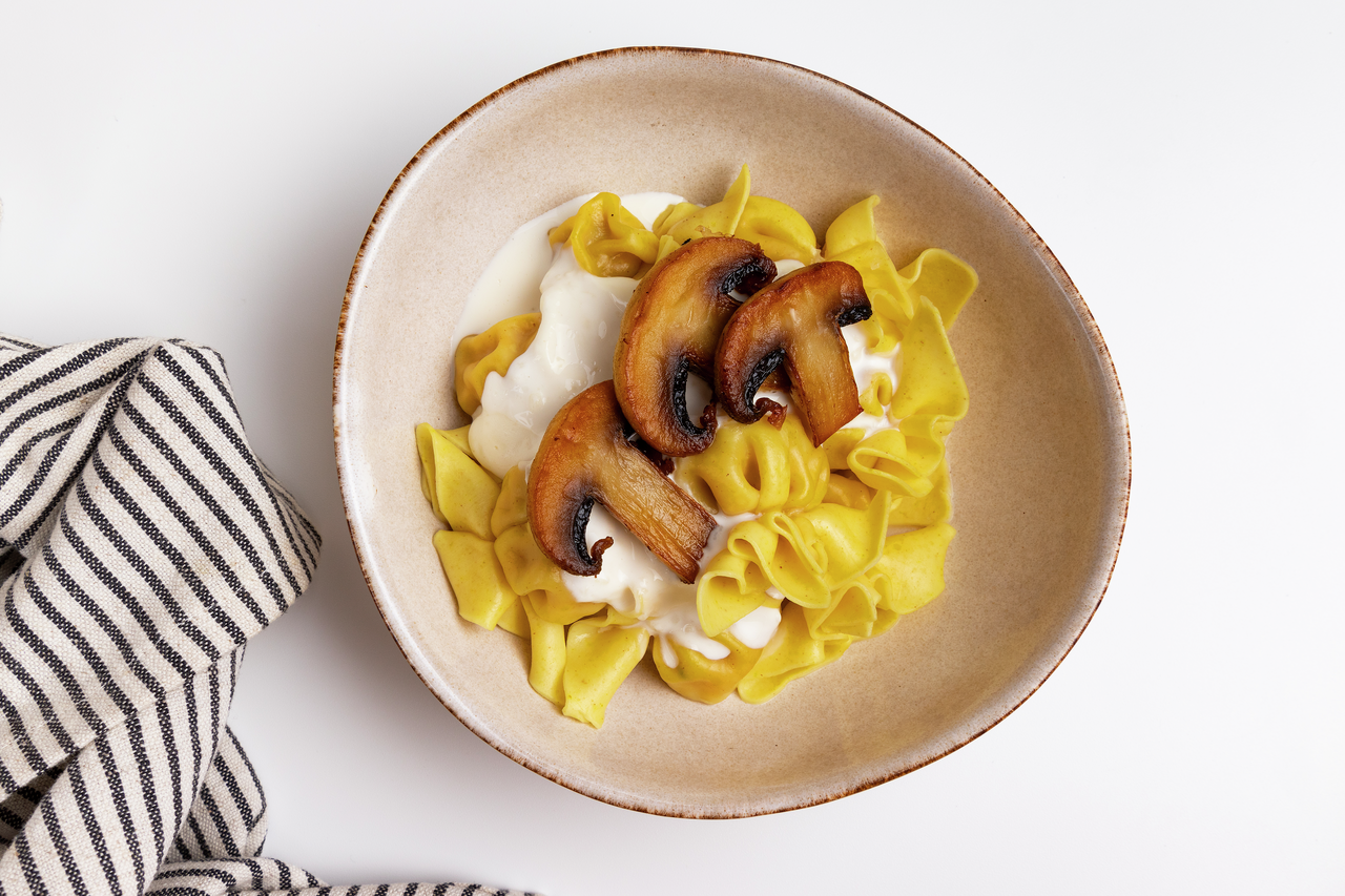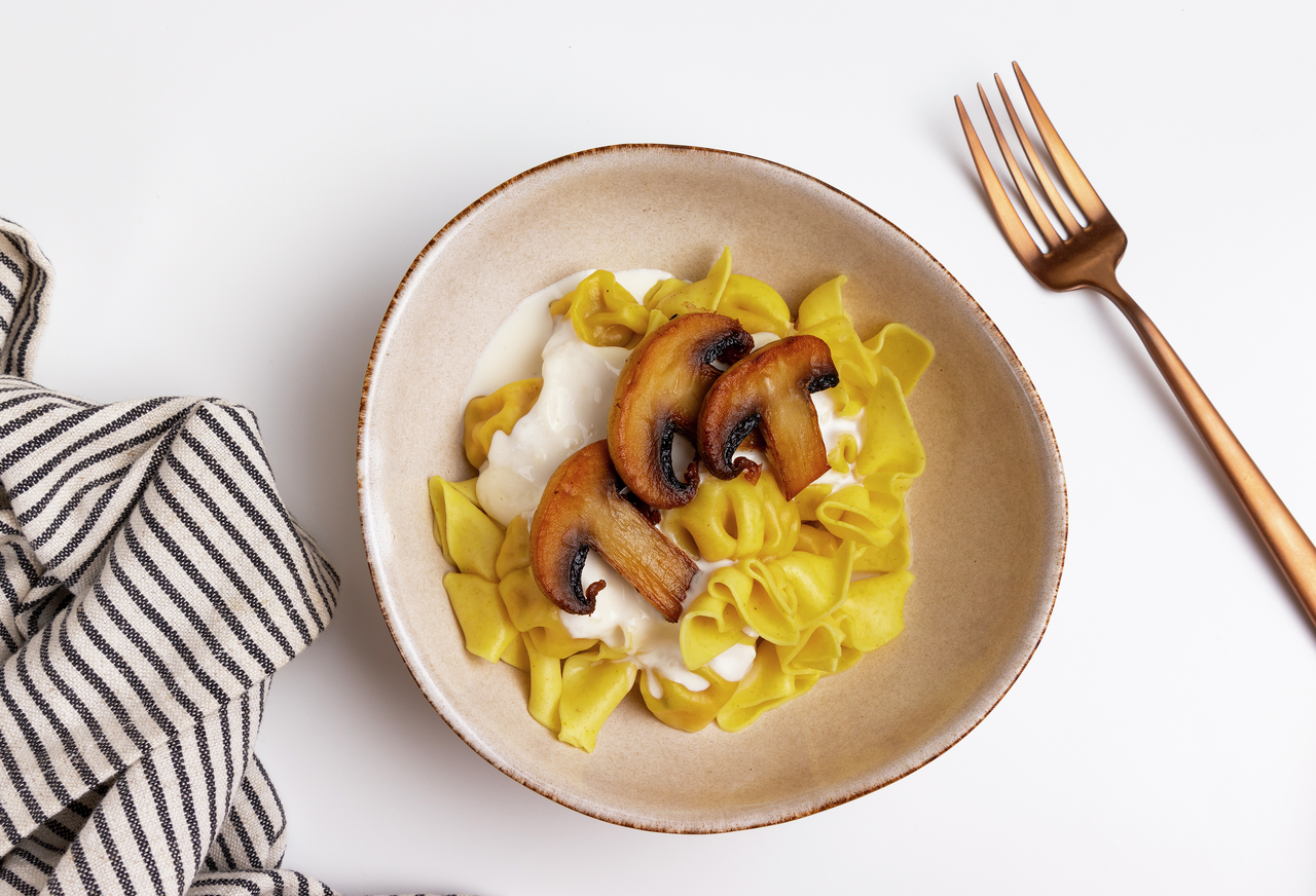 Мука из твердой пшеницы для макаронных изделий высшего сорта (крупка), мука пшеничная хлебопекарная высшего сорта, меланж яичный жидкий, вода питьевая, куркума), начинка (филе грудки куриное, грибы шампиньоны свежие, сыр мягкий "Моцарелла" м.д.ж в сухом веществе 40% (молоко нормализованное, соль пищевая, закваска термофильных микроорганизмов, молокосвертывающий ферментный препарат микробного происхождения) сливки м.д.ж 22%, масло сладко-сливочное м.д.ж 82,5 %, масло оливковое, зелень петрушки свежая, соль пищевая, бульон грибной сухой, чеснок свежий, перцы молотые (черный, зеленый, розовый, душистый, белый), грибы белые сушеные.