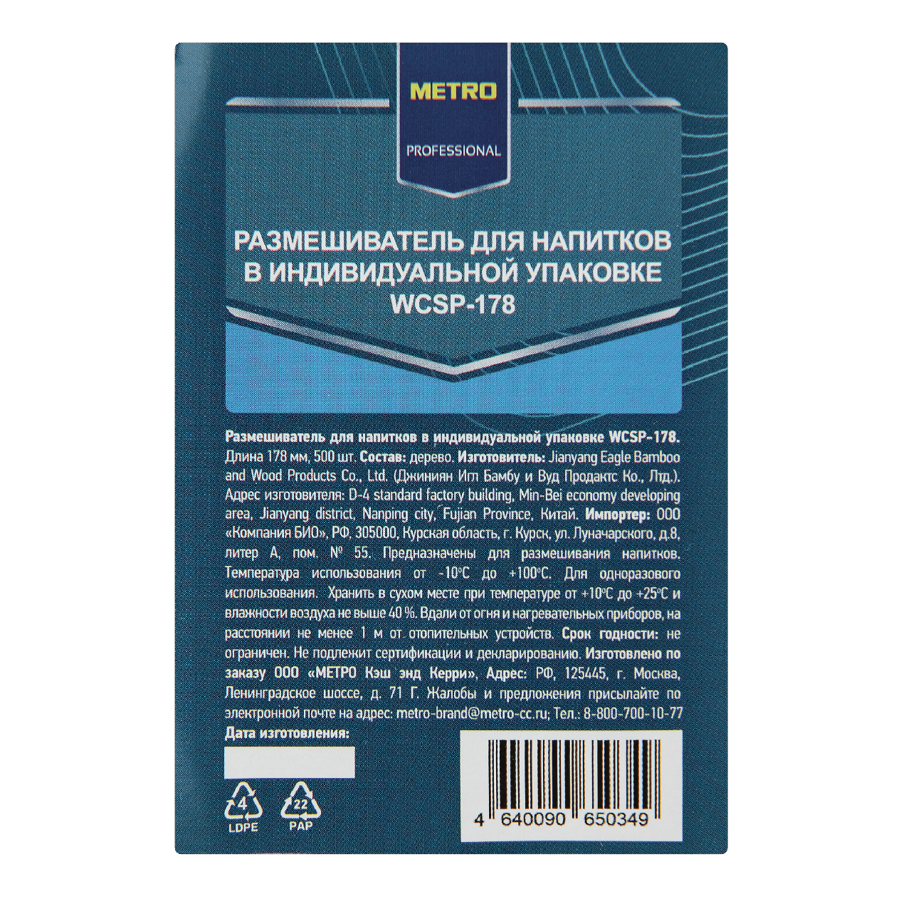 METRO PROFESSIONAL Размешиватель для напитков одноразовый деревянный в индивидуальной упаковке 17.8см, 500шт