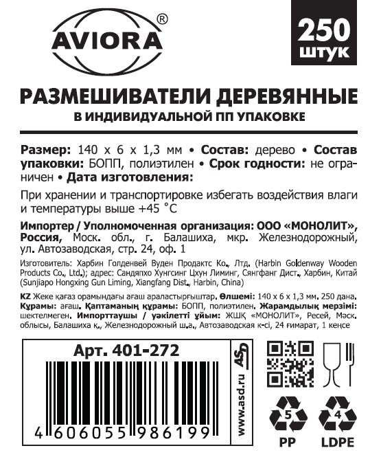 Размешиватели для напитков Aviora деревянные в индивидуальной упаковке 140мм, 250шт