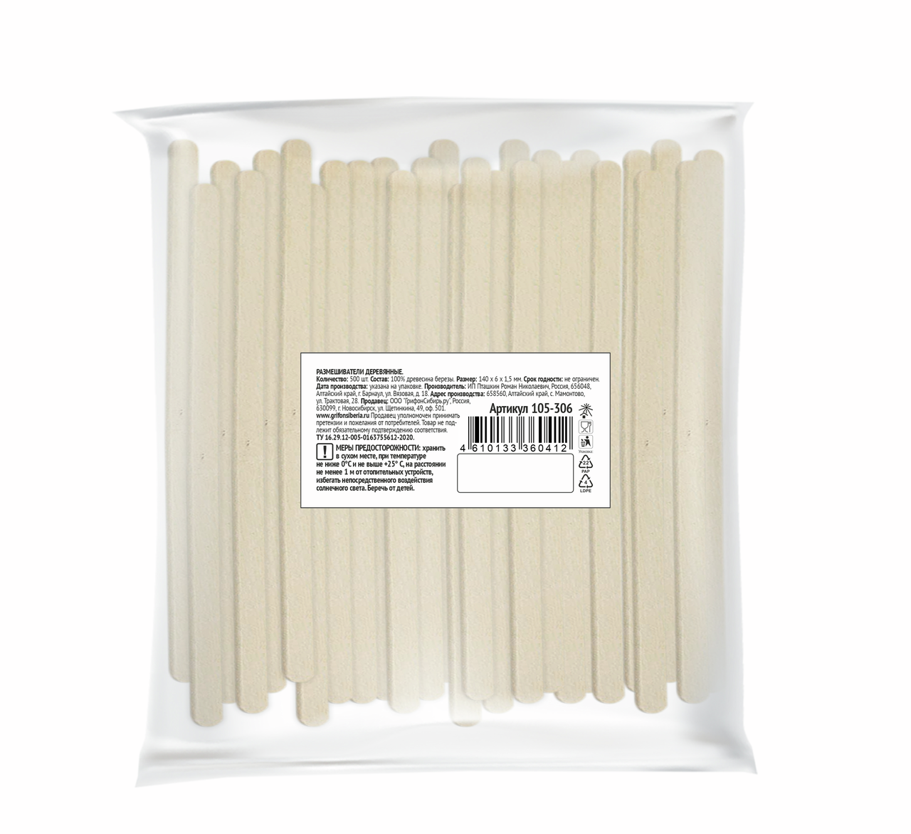 Размешиватель для напитков одноразовый Grifon деревянный 14см, 500шт