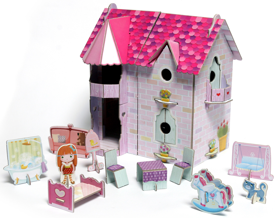Прочти историю вкнижке. Собери кукольный домик и расставь в нем предметы и мебель.