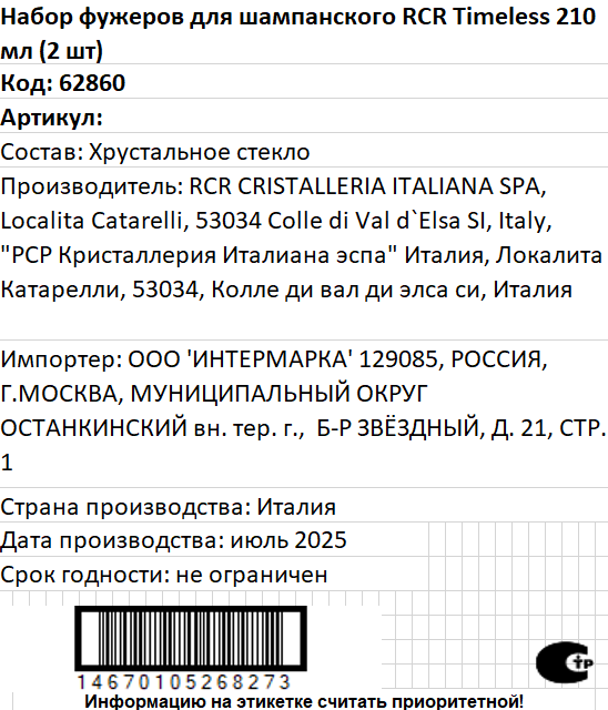 Бокал для шампанского RCR Timeless 2шт, 210мл
