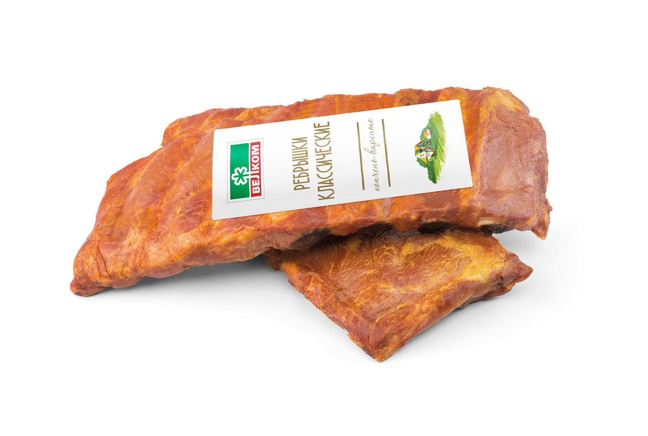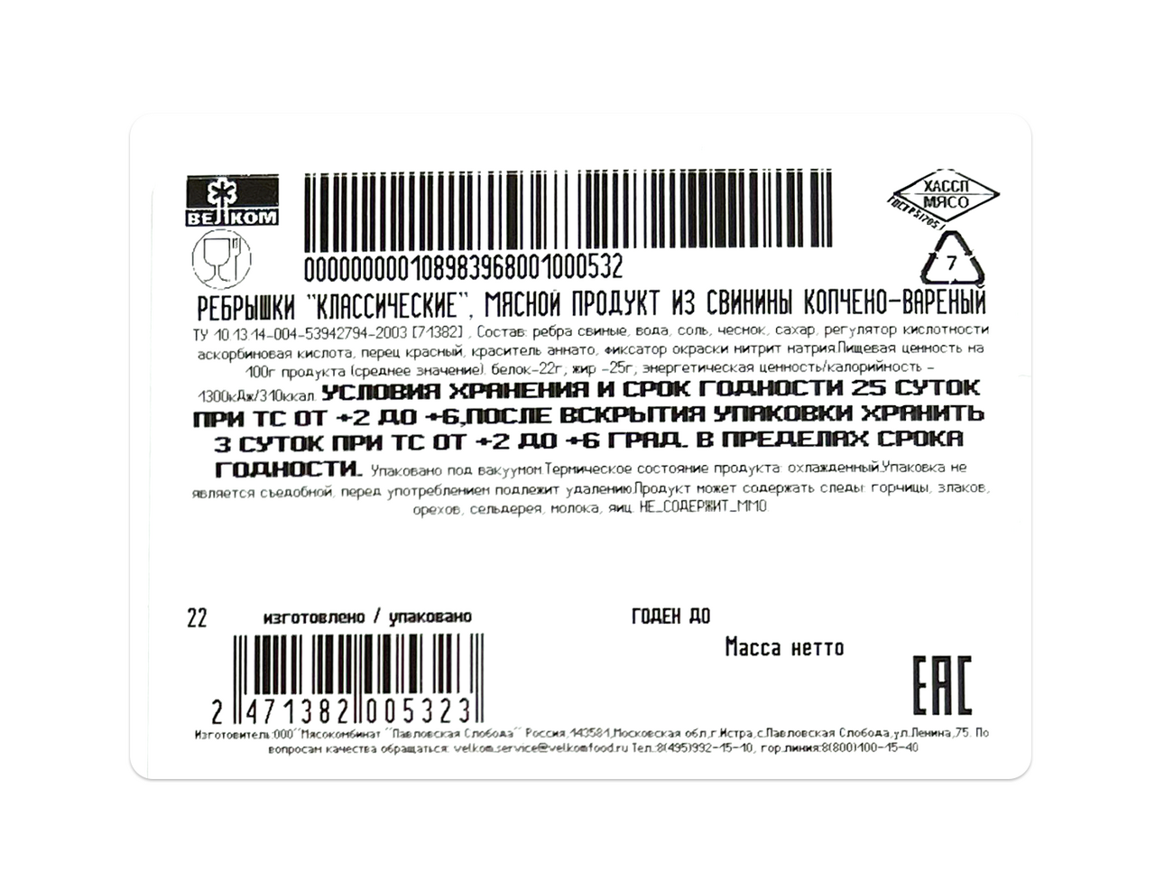 Ребрышки Велком Классические свиные копчено-вареные охлажденные, 0,5-0,8кг. Мясной продукт из свинины копчено-вареный. Упаковано под вакуумом. Не содержит ГМО. Без Сои. Состав: ребра свиные, вода, чеснок, сахар, перец красный, соль нитритная (соль, фиксатор окраски нитрит натрия). На предприятии используются горчица, глютен, молоко, орехи, сельдерей, яйца и продукты их переработки. Пищевая и энергетическая ценности: белок 22г, жиры 25г. Энергетическая ценность: 1300кДж/310ккал. Хранить при температуре от +2'C до +6'C. После вскрытия упаковки хранить 3 суток в пределах срока годности. Срок годности 20 суток. Состав короба: 4шт.