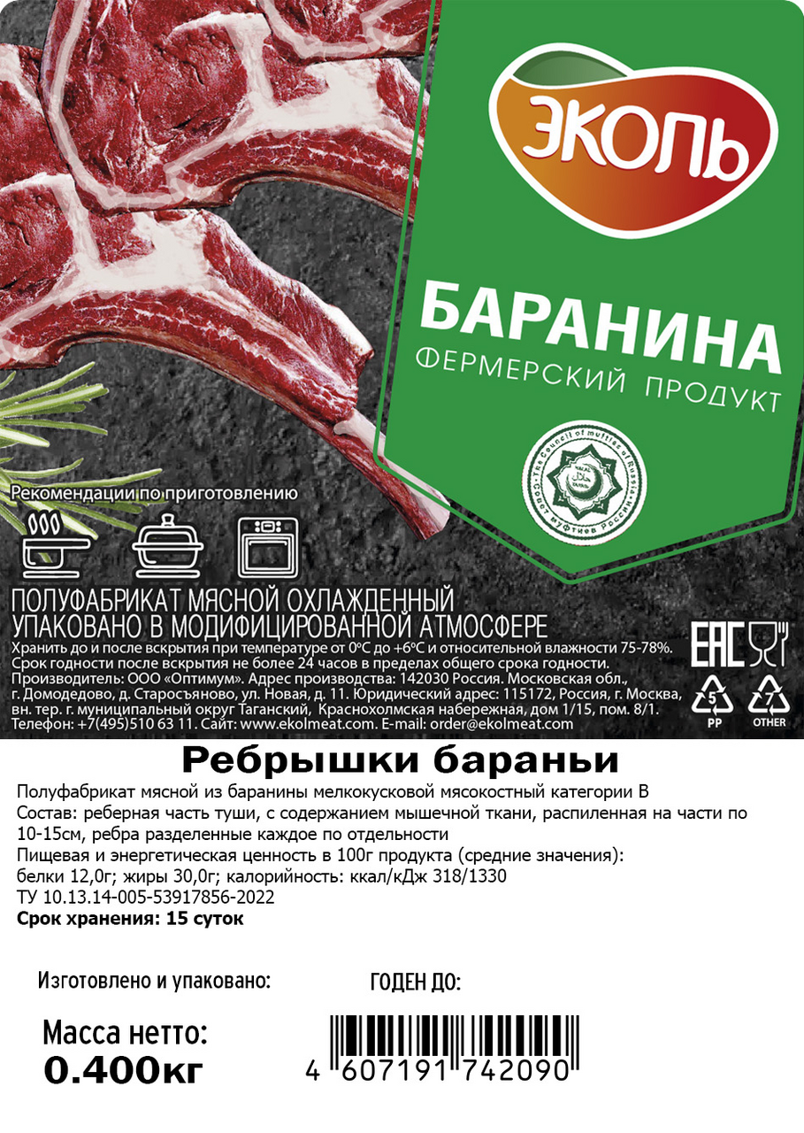 Ребрышки бараньи Эколь Халяль охлажденные, 400г употребляемая в пищу часть туши барана. Она отличается наличием плёнок и повышенным содержанием жировых тканей. Мясо употребляется в пищу в тушёном, отварном, жареном виде.