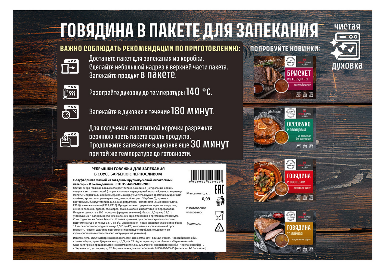 Ребра говяжьи, вода, масло растительное, маринад (натуральные овощи, паприка, перец чёрный, чеснок, кориандр, соль, сахар), усилитель вкуса и аромата Е621, крахмал картофельный, регуляторы кислотности, лимонная кислота Е331, загуститель Е415, вишня сушёная, ароматизаторы чернослив, барбекю, антиокислители Е223, Е316.