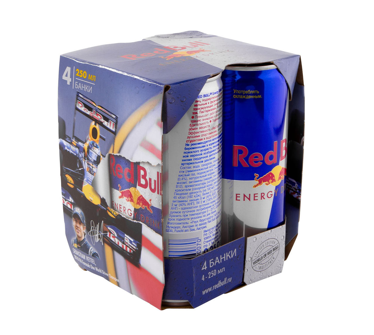 "Red Bull Energy Drink — безалкогольный энергетический газированный напиток. Энергетические напитки Red Bull содержат ингредиенты высокого качества: кофеин, таурин, витамины B, сахар и воду из альпийских регионов. В одной банке Red Bull 250 мл содержится столько же кофеина, сколько в чашке кофе такого же объема.Количество сахара в энергетическом напитке Red Bull сопоставимо с уровнем сахара в яблочном или апельсиновом соке – 11г на 100 мл.Банки Red Bull сделаны из 100% перерабатываемого алюминия.Бодрит тело и дух."
