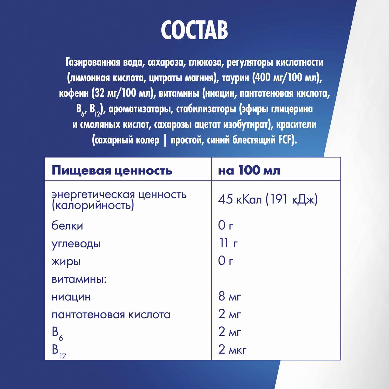 Газированная вода, сахароза, глюкоза, регуляторы кислотности (лимонная кислота, цитраты натрия), таурин (400 мг/100 мл), кофеин (32 мг/100 мл), витамины (ниацин, пантотеновая кислота, В6, В12), ароматизаторы, стабилизаторы (эфиры глицерина и cмоляных киcлот, cахарозы ацетат изобутират), красители (сахарный колер I простой, синий блестящий FCF).