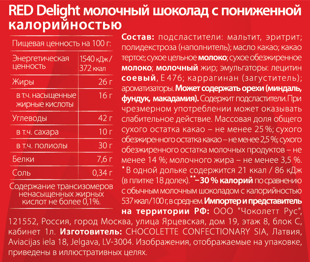 RED классический молочный шоколад, без сахара, на 30% меньше калорий, 100 г. RED - легкий и вкусный шоколад без сахара. Какао-бобы из Кот-д’Ивуара и отборное молоко придают нашему шоколаду восхитительный сливочный вкус и нежную текстуру.Без добавления сахара. Вместо сахара подсластители, получаемые из фруктов и растений.Меньше калорий: до -30% меньше калорий, чем в аналогичном шоколаде других марок.Вкусный: отборное какао из Cte d’Ivoire и нежный сливочный вкус молочного шоколада, который так ценят потребители.Отличный выбор для ЗОЖ и пп: без добавления сахара, меньше калорий и углеводов, без пальмового масла, без глютена, подходит для читмила.Сделано в Европе: шоколад RED изготавливает швейцарская компания Chocolette Confectionary на своей новой фабрике в Латвии. Качество шоколада гарантиро��ано сертификатом BRC, признанным в 30 странах мира.
