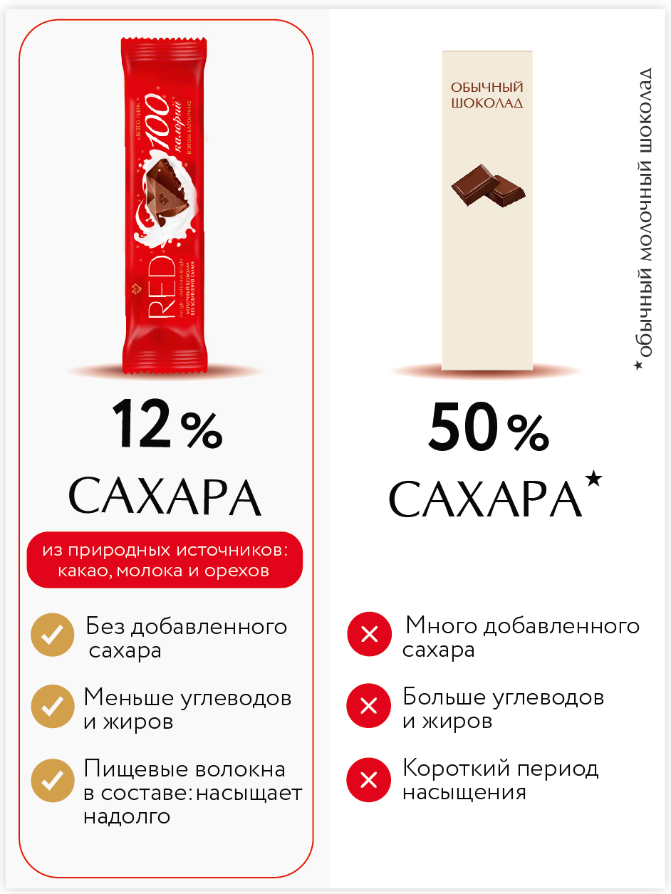 Полезные и здоровые сладости! Какао-бобы из Кот-д’Ивуара и отборное молоко придают нашему шоколаду восхитительный сливочный вкус и нежную текстуру. Теперь в удобном формате батончика - удобно взять с собой на перекус. А еще Red это: Меньше калорий, чем в аналогичном шоколаде других марок. Приятный вкус: отборное какао из Cte d’Ivoire и особая рецептура, благодаря которым вкус шоколада Red так ценят потребители. Red - как часть спортивного питания: в одном шоколадном батончике Red всего 100 ккал - удобно при подсчете калорий; он сладкий, но без сахара - идеально для читмила (планового нарушения диеты).