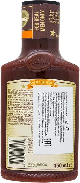 Соус Remia Медовый bbq, 450 мл – отличная приправа к блюдам из мяса, приготовленная на томатной основе с добавлением меда, пряных специй и ароматной горчицы. Если сравнивать его с классическим, то медовый более мягкий на вкус, деликатный, острота специй приглушается сладостью меда. Эту приправу можно использовать не только при подаче блюд, но и при их приготовлении. Отлично подходит для стейков, гамбургеров, рыбы, ребрышек. Вы сможете разнообразить этим соусом любимое свое блюдо, придав ему изюминку и особую пикантность. Благодаря меду и сиропу глюкозы, обмазанные этим соусом продукты при обжарке на открытом огне приобретают глянцевый блеск и аппетитную корочку.