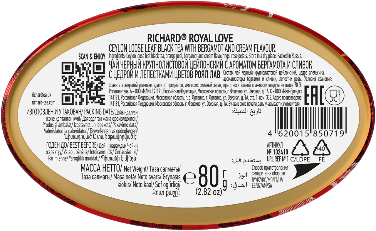 Чай Richard Royal Love чёрный цейлонский крупнолистовой с ароматом бергамота и ванили, 80г